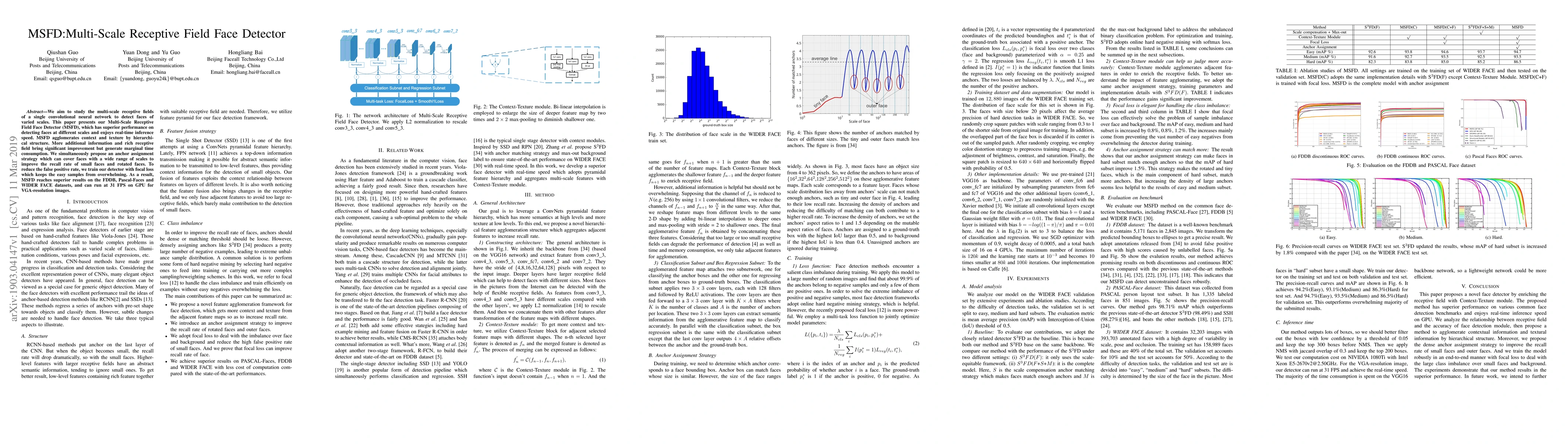 We aim to study the multi-scale receptive fields of a single convolutional neural network to detect faces of varied scales. This paper presents our Multi-Scale Receptive Field Face Detector (MSFD), which has superior performance on detecting faces at different scales and enjoys real-time inference speed. MSFD agglomerates context and texture by hierarchical structure. More additional information and rich receptive field bring significant improvement but generate marginal time consumption. We simultaneously propose an anchor assignment strategy which can cover faces with a wide range of scales to improve the recall rate of small faces and rotated faces. To reduce the false positive rate, we train our detector with focal loss which keeps the easy samples from overwhelming. As a result, MSFD reaches superior results on the FDDB, Pascal-Faces and WIDER FACE datasets, and can run at 31 FPS on GPU for VGA-resolution images.