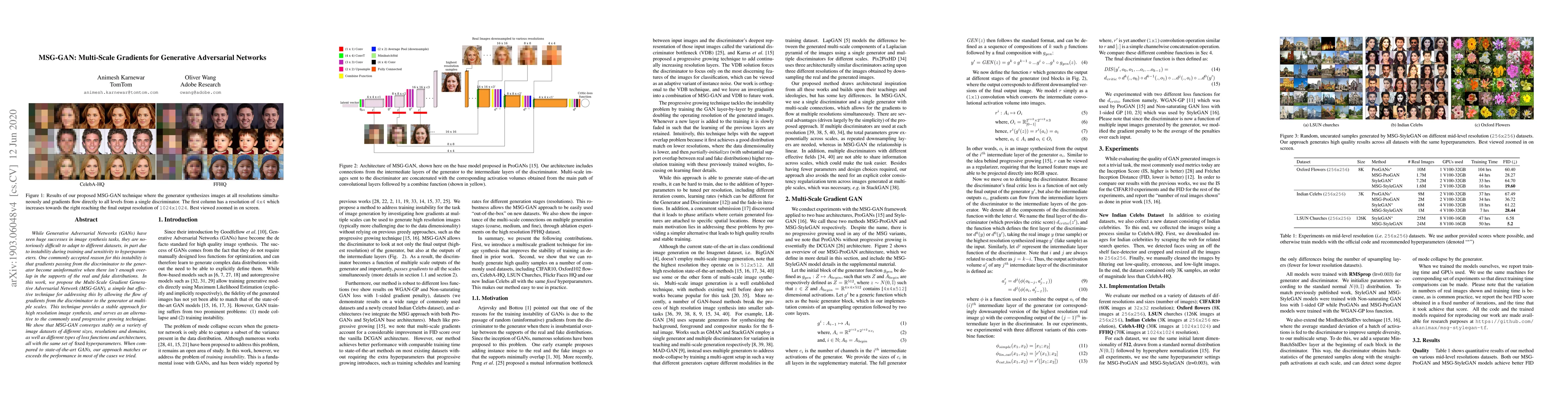 The MSG-GAN introduces a method for stabilizing GAN training by allowing gradient flow at multiple scales, addressing instability and hyperparameter sensitivity. This approach yields stable convergence on diverse datasets and outperforms or matches state-of-the-art GANs in various scenarios.