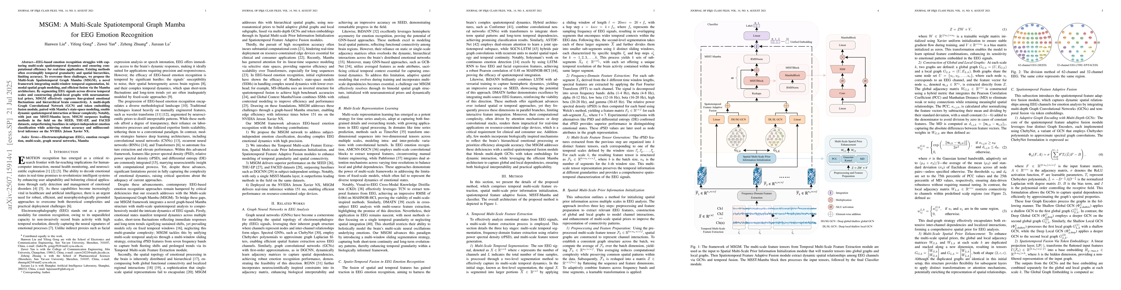 EEG-based emotion recognition struggles with capturing multi-scale spatiotemporal dynamics and ensuring computational efficiency for real-time applications. Existing methods often oversimplify temporal granularity and spatial hierarchies, limiting accuracy. To overcome these challenges, we propose the Multi-Scale Spatiotemporal Graph Mamba (MSGM), a novel framework integrating multi-window temporal segmentation, bimodal spatial graph modeling, and efficient fusion via the Mamba architecture. By segmenting EEG signals across diverse temporal scales and constructing global-local graphs with neuroanatomical priors, MSGM effectively captures fine-grained emotional fluctuations and hierarchical brain connectivity. A multi-depth Graph Convolutional Network (GCN) and token embedding fusion module, paired with Mamba's state-space modeling, enable dynamic spatiotemporal interaction at linear complexity. Notably, with just one MSST-Mamba layer, MSGM surpasses leading methods in the field on the SEED, THU-EP, and FACED datasets, outperforming baselines in subject-independent emotion classification while achieving robust accuracy and millisecond-level inference on the NVIDIA Jetson Xavier NX.