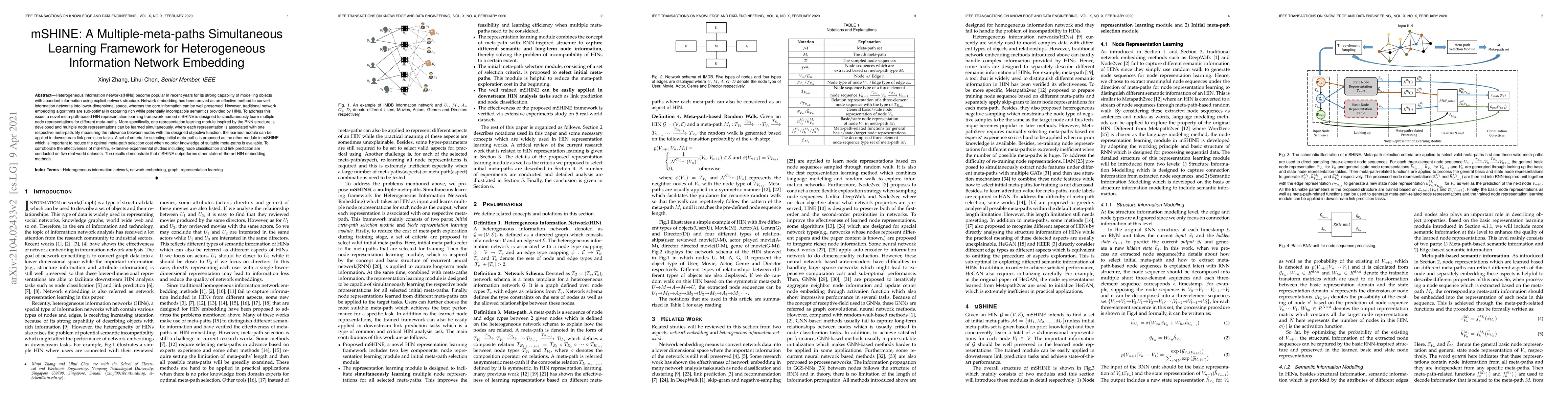 mSHINE is a novel framework for embedding heterogeneous information networks by simultaneously learning multiple meta-path-based node representations. It outperforms other state-of-the-art methods in tasks like node classification and link prediction, as demonstrated through experiments on five real-world datasets.