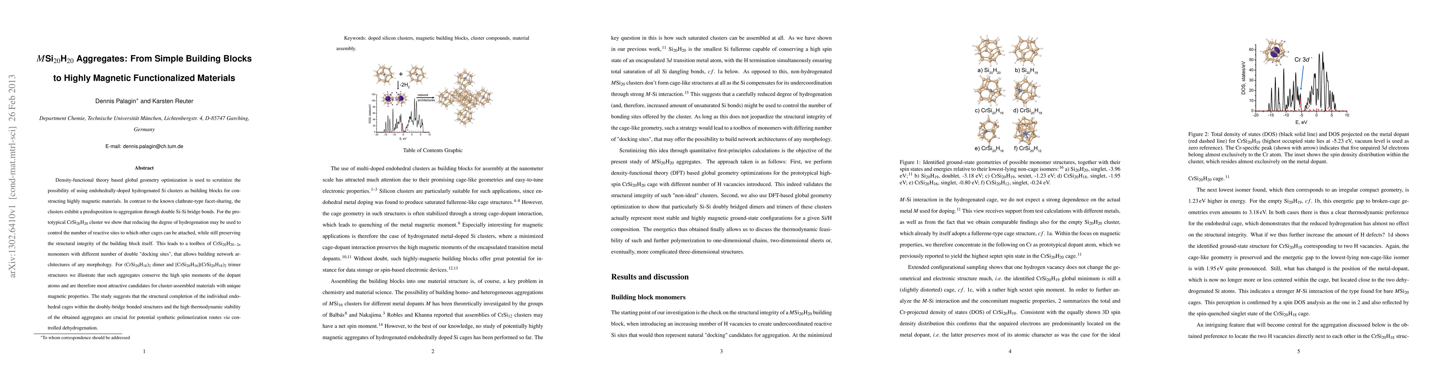 Density-functional theory based global geometry optimization is used to scrutinize the possibility of using endohedrally-doped hydrogenated Si clusters as building blocks for constructing highly magnetic materials. In contrast to the known clathrate-type facet-sharing, the clusters exhibit a predisposition to aggregation through double Si-Si bridge bonds. For the prototypical CrSi$_{20}$H$_{20}$ cluster we show that reducing the degree of hydrogenation may be used to control the number of reactive sites to which other cages can be attached, while still preserving the structural integrity of the building block itself. This leads to a toolbox of CrSi$_{20}$H$_{20-2n}$ monomers with different number of double "docking sites", that allows building network architectures of any morphology. For (CrSi$_{20}$H$_{18}$)$_{2}$ dimer and [CrSi$_{20}$H$_{16}$](CrSi$_{20}$H$_{18}$)$_{2}$ trimer structures we illustrate that such aggregates conserve the high spin moments of the dopant atoms and are therefore most attractive candidates for cluster-assembled materials with unique magnetic properties. The study suggests that the structural completion of the individual endohedral cages within the doubly-bridge bonded structures and the high thermodynamic stability of the obtained aggregates are crucial for potential synthetic polymerization routes $via$ controlled dehydrogenation.