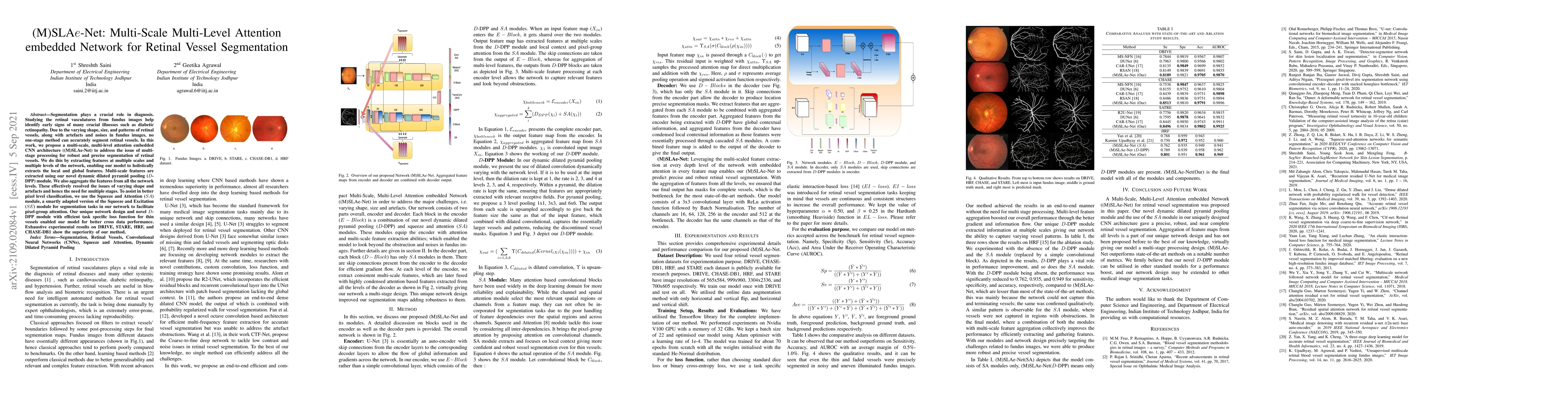 The paper proposes (M)SLAe-Net, a multi-scale, multi-level attention embedded CNN architecture for precise retinal vessel segmentation in fundus images, leveraging dynamic dilated pyramid pooling and Squeeze and Attention modules to address varying vessel shapes and artefacts. Experimental results demonstrate superior performance on multiple datasets.