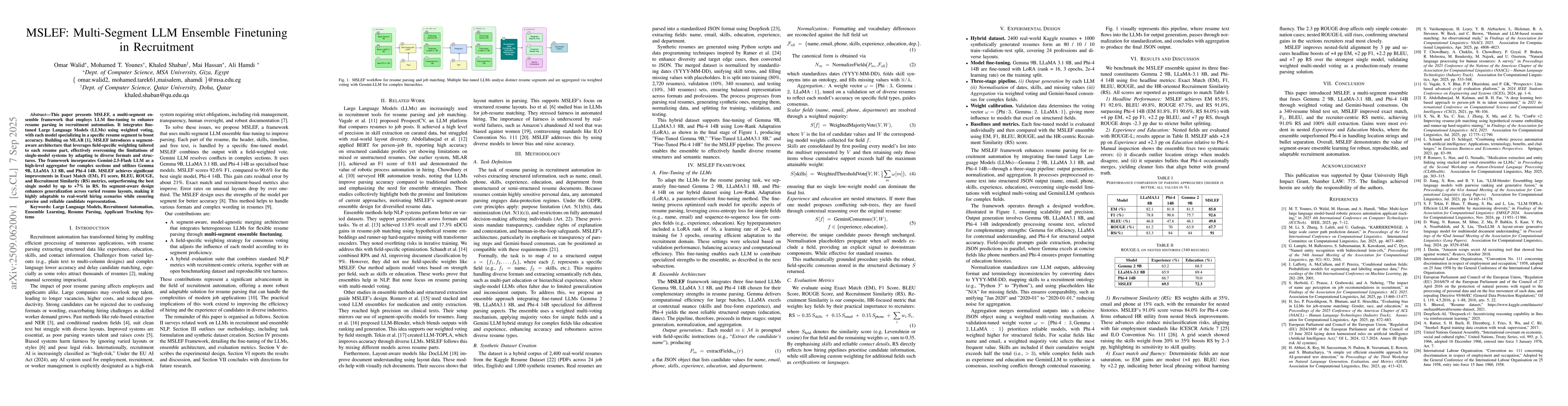 This paper presents MSLEF, a multi-segment ensemble framework that employs LLM fine-tuning to enhance resume parsing in recruitment automation. It integrates fine-tuned Large Language Models (LLMs) using weighted voting, with each model specializing in a specific resume segment to boost accuracy. Building on MLAR , MSLEF introduces a segment-aware architecture that leverages field-specific weighting tailored to each resume part, effectively overcoming the limitations of single-model systems by adapting to diverse formats and structures. The framework incorporates Gemini-2.5-Flash LLM as a high-level aggregator for complex sections and utilizes Gemma 9B, LLaMA 3.1 8B, and Phi-4 14B. MSLEF achieves significant improvements in Exact Match (EM), F1 score, BLEU, ROUGE, and Recruitment Similarity (RS) metrics, outperforming the best single model by up to +7% in RS. Its segment-aware design enhances generalization across varied resume layouts, making it highly adaptable to real-world hiring scenarios while ensuring precise and reliable candidate representation.