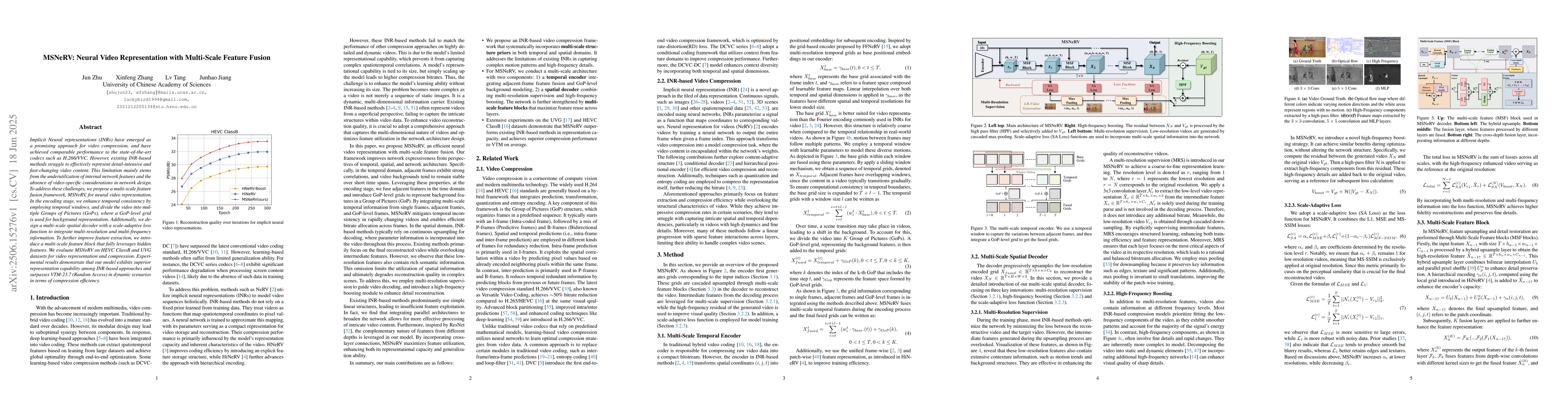 Implicit Neural representations (INRs) have emerged as a promising approach for video compression, and have achieved comparable performance to the state-of-the-art codecs such as H.266/VVC. However, existing INR-based methods struggle to effectively represent detail-intensive and fast-changing video content. This limitation mainly stems from the underutilization of internal network features and the absence of video-specific considerations in network design. To address these challenges, we propose a multi-scale feature fusion framework, MSNeRV, for neural video representation. In the encoding stage, we enhance temporal consistency by employing temporal windows, and divide the video into multiple Groups of Pictures (GoPs), where a GoP-level grid is used for background representation. Additionally, we design a multi-scale spatial decoder with a scale-adaptive loss function to integrate multi-resolution and multi-frequency information. To further improve feature extraction, we introduce a multi-scale feature block that fully leverages hidden features. We evaluate MSNeRV on HEVC ClassB and UVG datasets for video representation and compression. Experimental results demonstrate that our model exhibits superior representation capability among INR-based approaches and surpasses VTM-23.7 (Random Access) in dynamic scenarios in terms of compression efficiency.