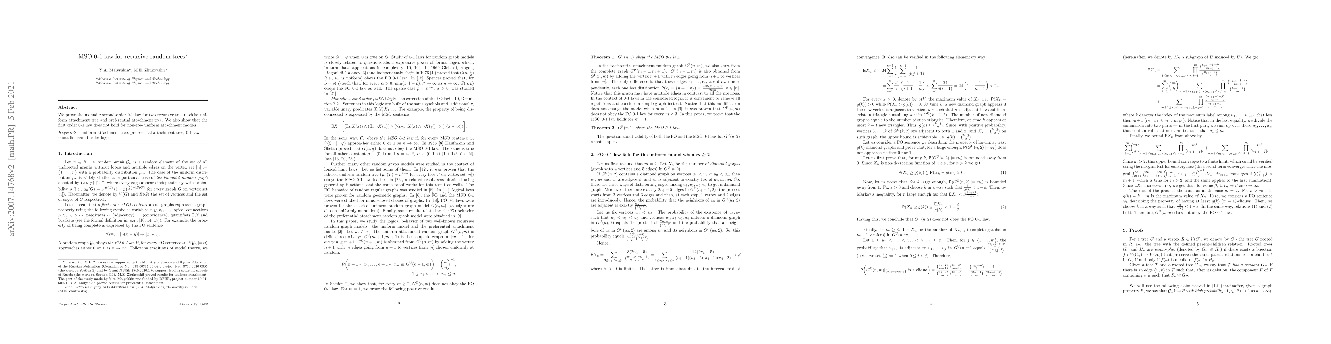 Summary: This paper establishes the monadic second order 0-1 law for uniform and preferential attachment recursive tree models, while demonstrating that the first order 0-1 law fails for non-tree uniform attachment models.