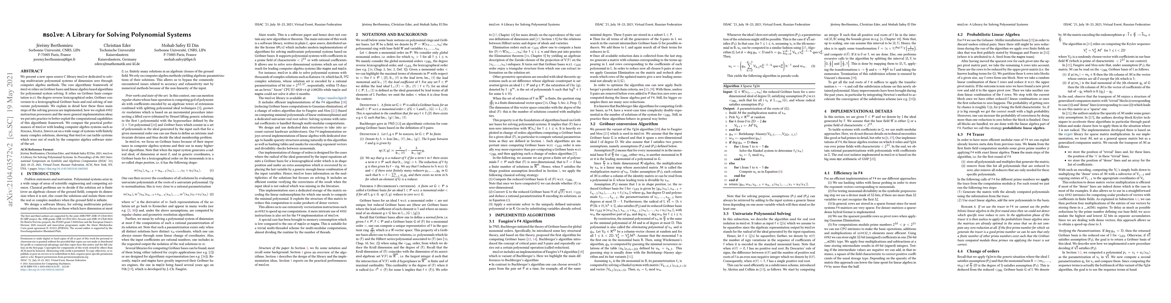 The paper introduces \texttt{msolve}, an open-source C library for solving multivariate polynomial systems using Gröbner bases and linear algebra. It demonstrates superior performance compared to leading computer algebra systems, tackling larger systems previously out of reach.