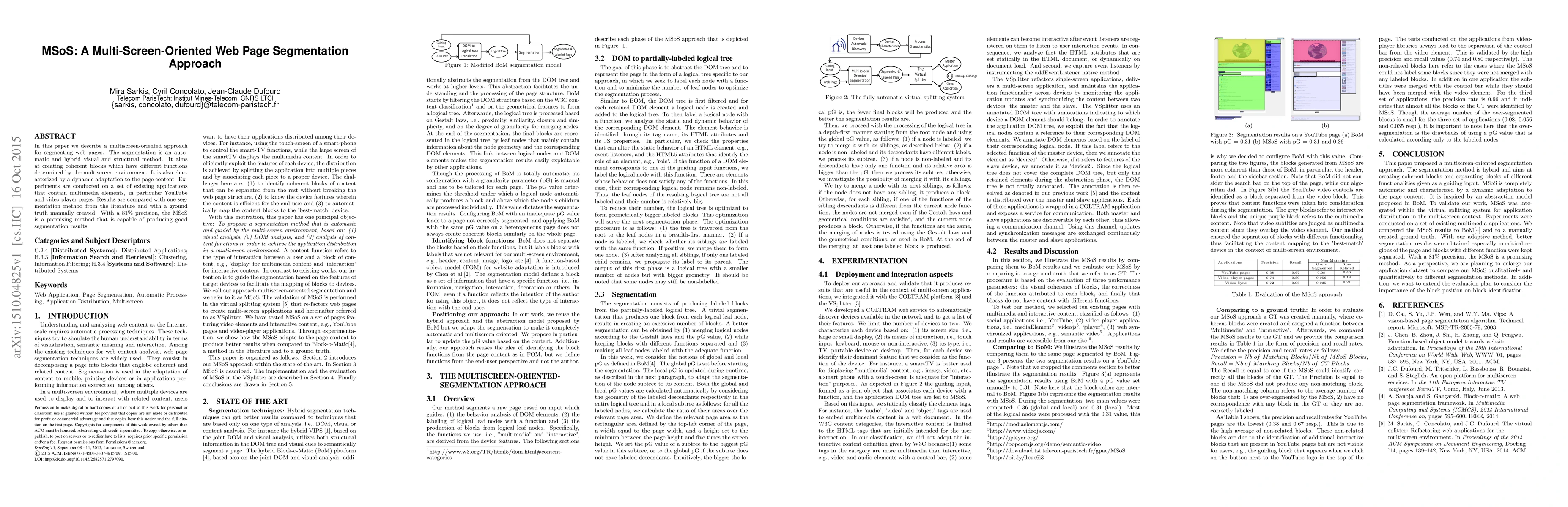 MSoS is a hybrid visual and structural method for automatically segmenting web pages into functional blocks tailored for multiscreen environments. Experiments on multimedia-rich sites like YouTube show it achieves 75% precision, outperforming a comparative method and demonstrating dynamic adaptation to content.
