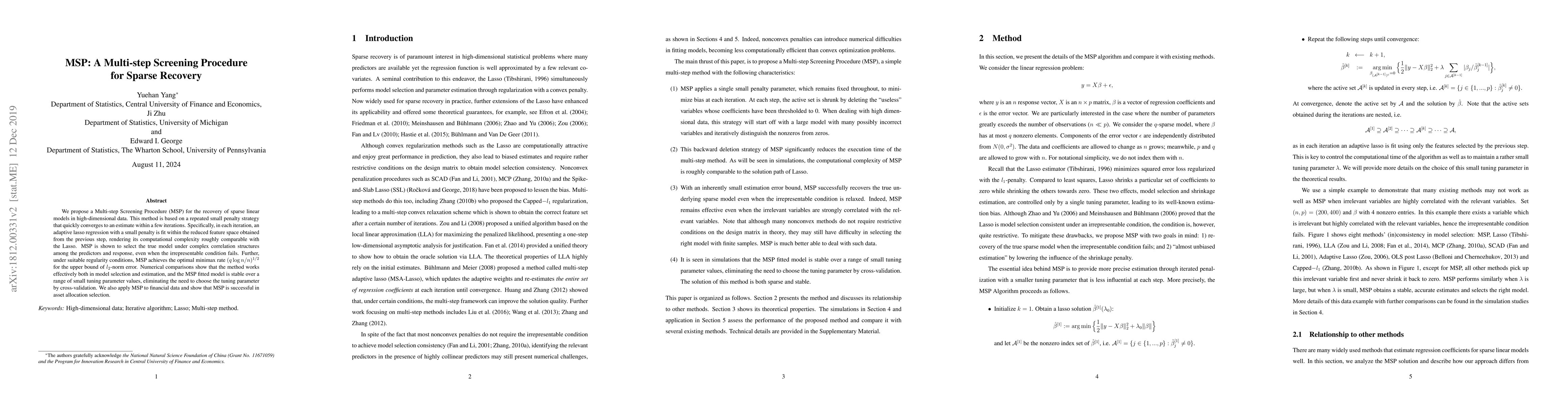 A new method called MSP (Multi-step Screening Procedure) is proposed for recovering sparse linear models from high-dimensional data, achieving optimal minimax rate and eliminating the need to choose a tuning parameter through cross-validation.
