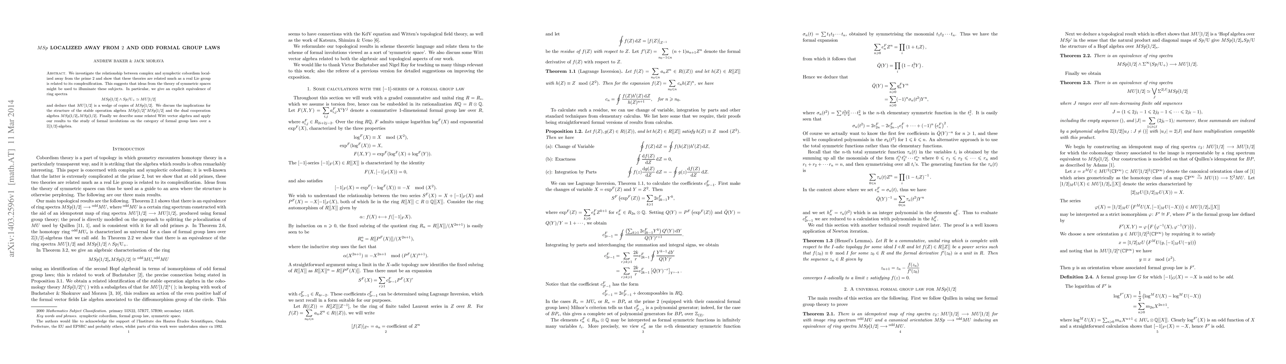 We investigate the relationship between complex and symplectic cobordism localized away from the prime~$2$ and show that these theories are related much as a real Lie group is related to its complexification. This suggests that ideas from the theory of symmetric spaces might be used to illuminate these subjects. In particular, we give an explicit equivalence of ring spectra \[ MSp[1/2]\wedge Sp/U_+\simeq MU[1/2] \] and deduce that $MU[1/2]$ is a wedge of copies of $MSp[1/2]$. We discuss the implications for the structure of the stable operation algebra $MSp[1/2]^*MSp[1/2]$ and the dual cooperation algebra $MSp[1/2]_*MSp[1/2]$. Finally we describe some related Witt vector algebra and apply our results to the study of formal involutions on the category of formal group laws over a $\mathbb{Z}[1/2]$-algebra.