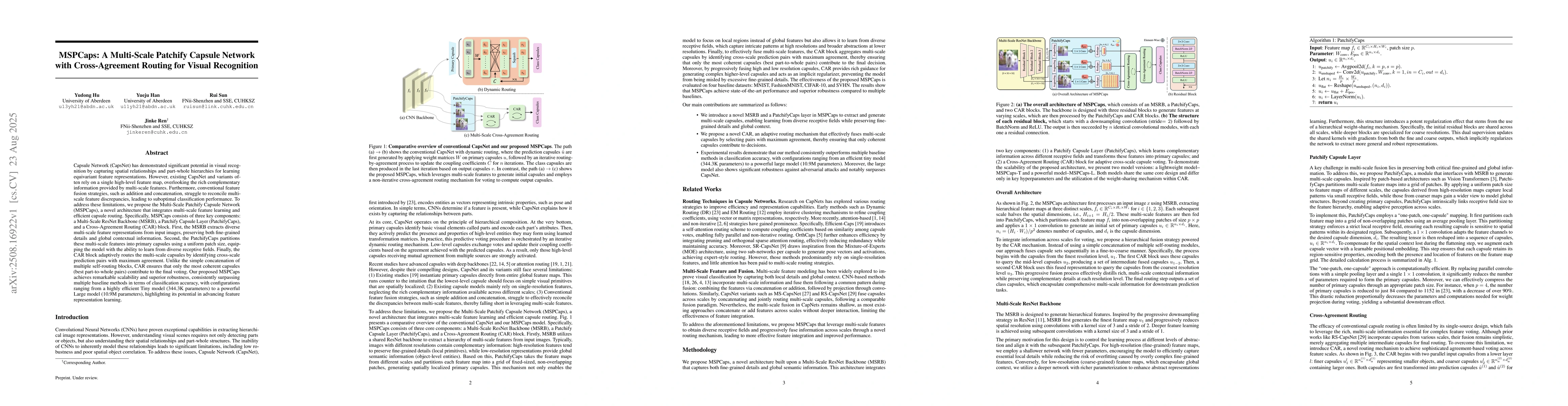 Capsule Network (CapsNet) has demonstrated significant potential in visual recognition by capturing spatial relationships and part-whole hierarchies for learning equivariant feature representations. However, existing CapsNet and variants often rely on a single high-level feature map, overlooking the rich complementary information from multi-scale features. Furthermore, conventional feature fusion strategies (e.g., addition and concatenation) struggle to reconcile multi-scale feature discrepancies, leading to suboptimal classification performance. To address these limitations, we propose the Multi-Scale Patchify Capsule Network (MSPCaps), a novel architecture that integrates multi-scale feature learning and efficient capsule routing. Specifically, MSPCaps consists of three key components: a Multi-Scale ResNet Backbone (MSRB), a Patchify Capsule Layer (PatchifyCaps), and Cross-Agreement Routing (CAR) blocks. First, the MSRB extracts diverse multi-scale feature representations from input images, preserving both fine-grained details and global contextual information. Second, the PatchifyCaps partitions these multi-scale features into primary capsules using a uniform patch size, equipping the model with the ability to learn from diverse receptive fields. Finally, the CAR block adaptively routes the multi-scale capsules by identifying cross-scale prediction pairs with maximum agreement. Unlike the simple concatenation of multiple self-routing blocks, CAR ensures that only the most coherent capsules contribute to the final voting. Our proposed MSPCaps achieves remarkable scalability and superior robustness, consistently surpassing multiple baseline methods in terms of classification accuracy, with configurations ranging from a highly efficient Tiny model (344.3K parameters) to a powerful Large model (10.9M parameters), highlighting its potential in advancing feature representation learning.