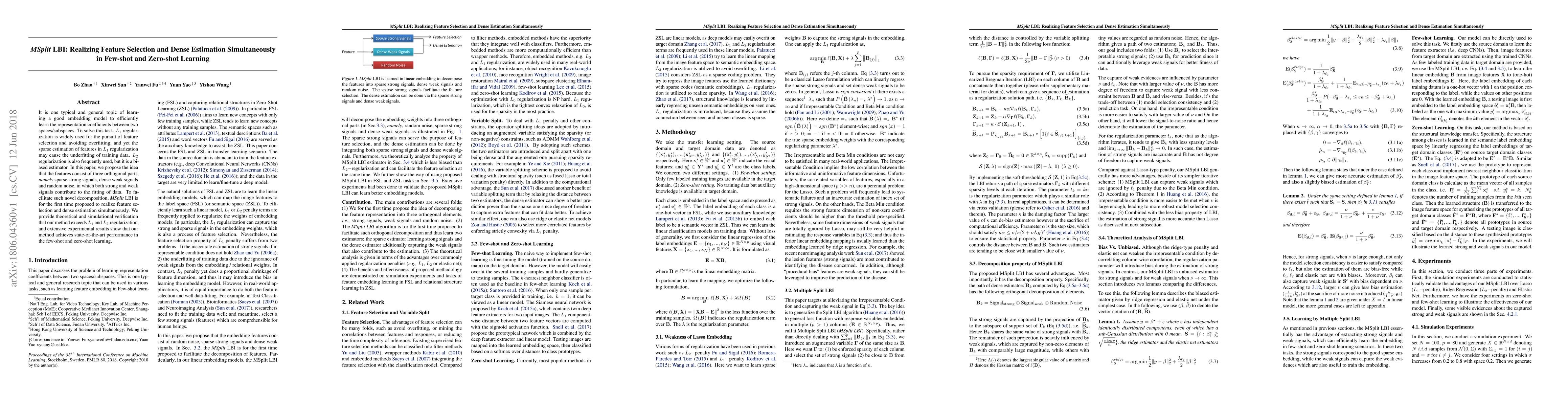 It is one typical and general topic of learning a good embedding model to efficiently learn the representation coefficients between two spaces/subspaces. To solve this task, $L_{1}$ regularization is widely used for the pursuit of feature selection and avoiding overfitting, and yet the sparse estimation of features in $L_{1}$ regularization may cause the underfitting of training data. $L_{2}$ regularization is also frequently used, but it is a biased estimator. In this paper, we propose the idea that the features consist of three orthogonal parts, \emph{namely} sparse strong signals, dense weak signals and random noise, in which both strong and weak signals contribute to the fitting of data. To facilitate such novel decomposition, \emph{MSplit} LBI is for the first time proposed to realize feature selection and dense estimation simultaneously. We provide theoretical and simulational verification that our method exceeds $L_{1}$ and $L_{2}$ regularization, and extensive experimental results show that our method achieves state-of-the-art performance in the few-shot and zero-shot learning.