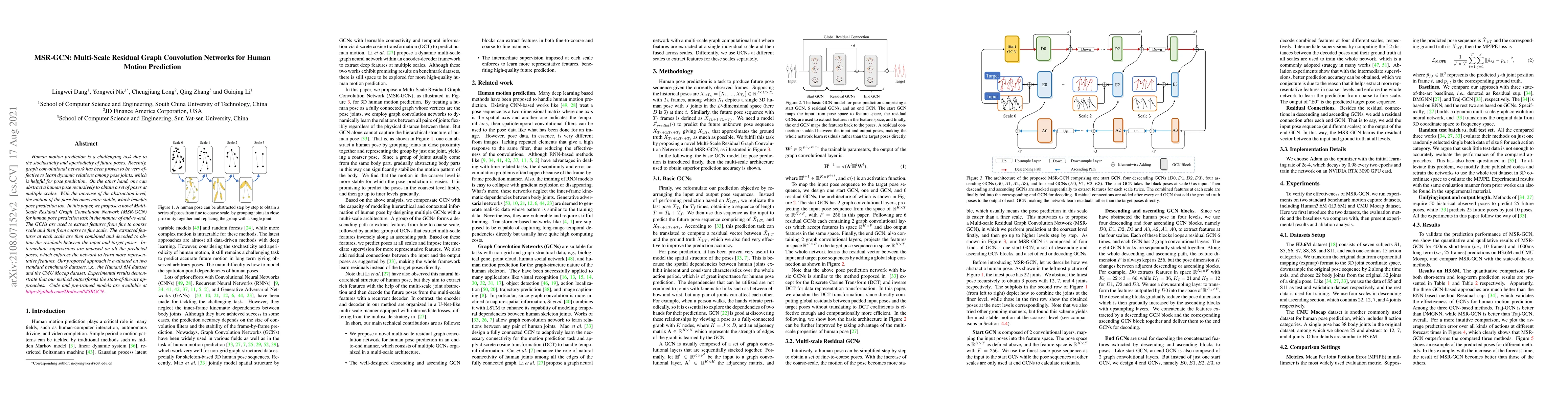 The paper proposes MSR-GCN, a Multi-Scale Residual Graph Convolution Network for human motion prediction, leveraging GCNs to extract features at multiple scales and combining them for improved pose prediction. Experimental results show superior performance over state-of-the-art methods on Human3.6M and CMU Mocap datasets.