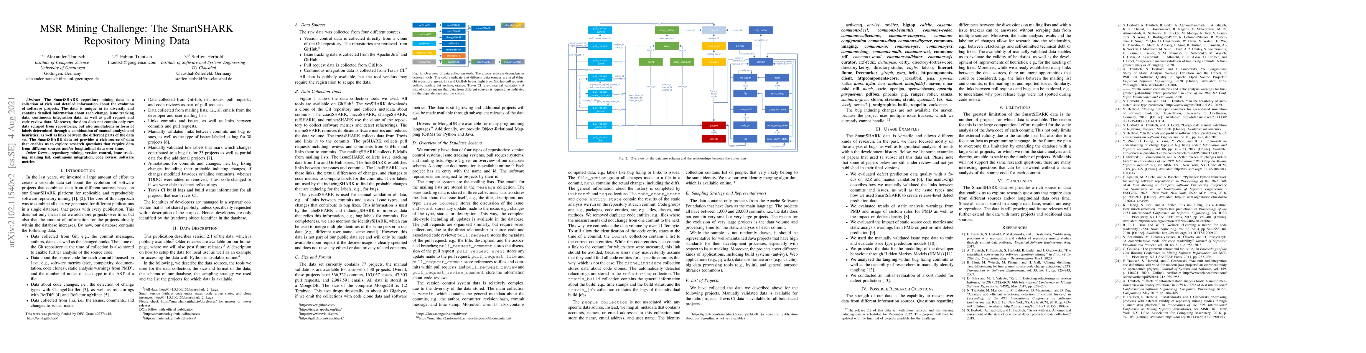 The SmartSHARK repository mining data is a collection of rich and detailed information about the evolution of software projects. The data is unique in its diversity and contains detailed information about each change, issue tracking data, continuous integration data, as well as pull request and code review data. Moreover, the data does not contain only raw data scraped from repositories, but also annotations in form of labels determined through a combination of manual analysis and heuristics, as well as links between the different parts of the data set. The SmartSHARK data set provides a rich source of data that enables us to explore research questions that require data from different sources and/or longitudinal data over time.