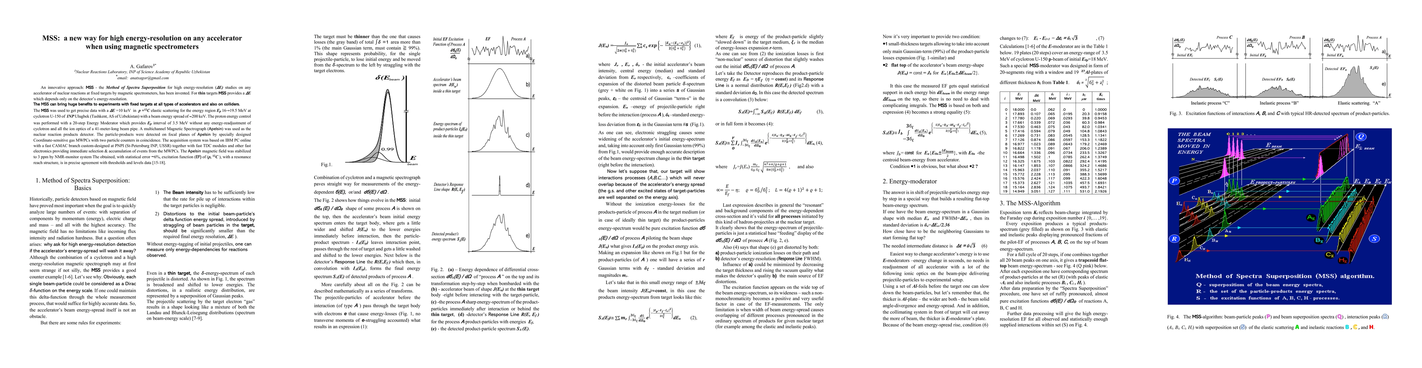An innovative approach: MSS - the Method of Spectra Superposition for high energy-resolution (Delta-E) studies on any accelerator of nuclear reactions at fixed targets by magnetic spectrometers, has been invented. For thin targets MSS provides a Delta-E which depends only on the detector's energy-resolution. The MSS can bring huge benefits to experiments with fixed targets at all types of accelerators and also on colliders. The MSS was used to get precise data with a Delta-E = 10 keV in (p,12C) elastic scattering for the energy region Ep 16 - 19.5 MeV at cyclotron U-150 of INP Ulugbek (Tashkent, AS of Uzbekistan) with a beam energy spread of about 200 keV. The proton energy control was performed with a 20-step Energy Moderator which provides Ep interval of 3.5 MeV without any energy-readjustment of cyclotron and all the ion optics of a 41-meter-long beam pipe. A multichannel Magnetic Spectrograph (Apelsin) was used as the nuclear reaction products detector. The particle-products were detected on focal planes of Apelsin by specially designed Coordinate-sensitive gas MWPCs with two particle counters in coincidence. The acquisition system was based on IBM PC online with a fast CAMAC branch custom-designed at PNPI (St-Petersburg INP, USSR) together with fast TDC modules and other fast electronics providing immediate selection and accumulation of events from the MWPCs. The Apelsin magnetic field was stabilized to 3 ppm by NMR-monitor system The obtained, with statistical error about 6%, excitation function (EF) of (p, 12C), with a resonance reach structure, is in precise agreement with thresholds and levels data [15-18].