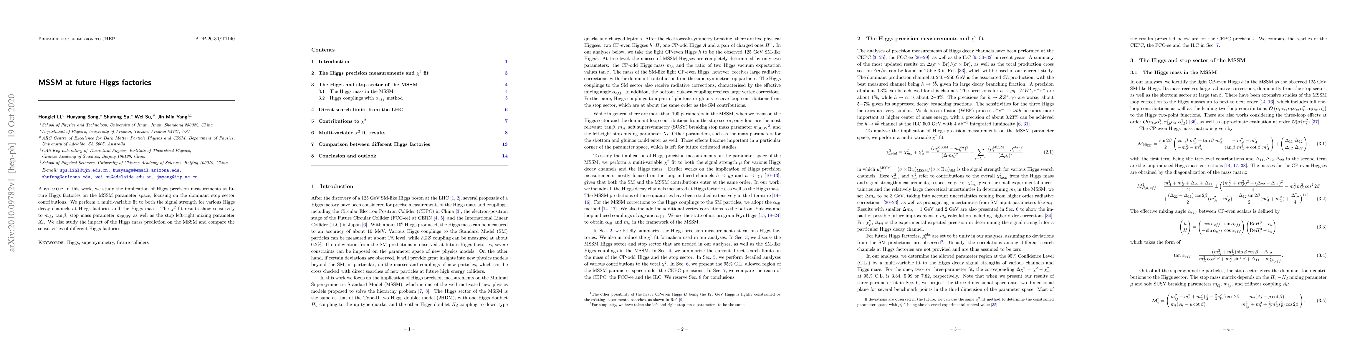 This paper investigates how precise Higgs measurements at future Higgs factories can constrain the Minimal Supersymmetric Standard Model (MSSM) parameter space, particularly focusing on stop sector contributions. The study uses a multi-variable fit to signal strengths and Higgs mass, revealing sensitivity to key parameters like mA, tan beta, mSUSY, and Xt.