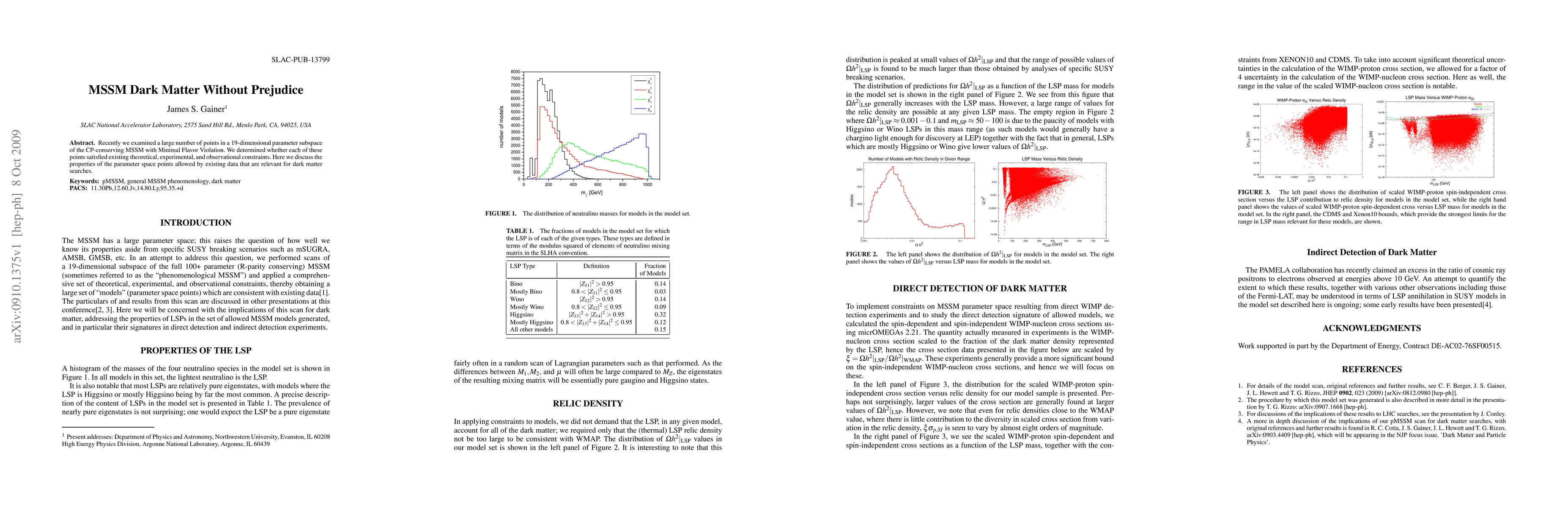 Recently we examined a large number of points in a 19-dimensional parameter subspace of the CP-conserving MSSM with Minimal Flavor Violation. We determined whether each of these points satisfied existing theoretical, experimental, and observational constraints. Here we discuss the properties of the parameter space points allowed by existing data that are relevant for dark matter searches.