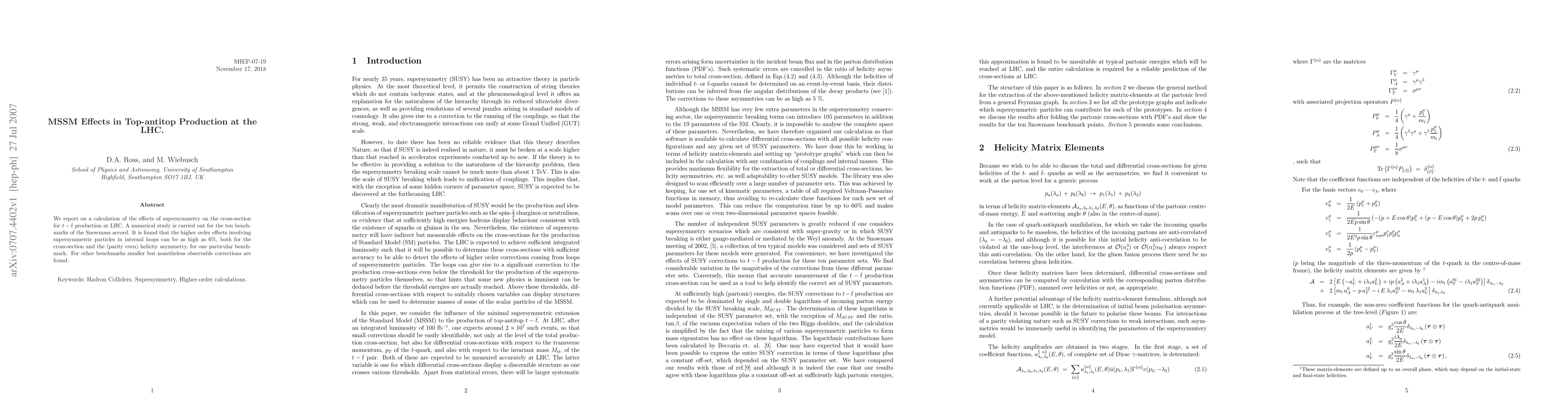 We report on a calculation of the effects of supersymmetry on the cross-section for top-antitop production at LHC. A numerical study is carried out for the ten benchmarks of the Snowmass accord. It is found that the higher order effects involving supersymmetric particles in internal loops can be as high as 6%, both for the cross-section and the (parity even) helicity asymmetry, for one particular benchmark. For other benchmarks smaller but nonetheless observable corrections are found.