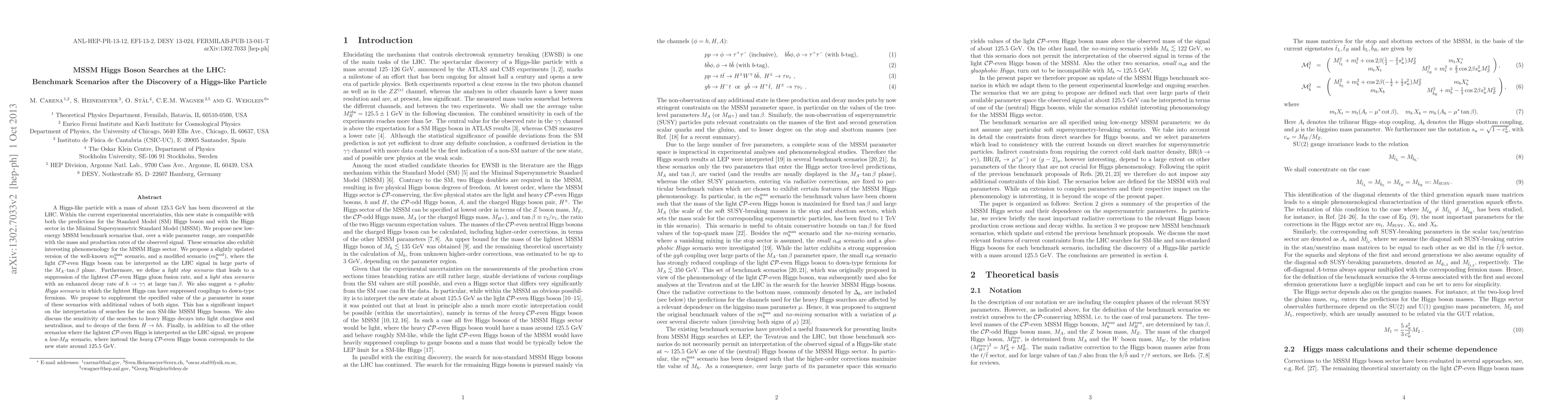 A Higgs-like particle with a mass of about 125.5 GeV has been discovered at the LHC. Within the current experimental uncertainties, this new state is compatible with both the predictions for the Standard Model (SM) Higgs boson and with the Higgs sector in the Minimal Supersymmetric Standard Model (MSSM). We propose new low-energy MSSM benchmark scenarios that, over a wide parameter range, are compatible with the mass and production rates of the observed signal. These scenarios also exhibit interesting phenomenology for the MSSM Higgs sector. We propose a slightly updated version of the well-known mh-max scenario, and a modified scenario (mh-mod), where the light CP-even Higgs boson can be interpreted as the LHC signal in large parts of the MA-tan \beta\ plane. Furthermore, we define a light stop scenario that leads to a suppression of the lightest CP-even Higgs gluon fusion rate, and a light stau scenario with an enhanced decay rate of h to \gamma\gamma\ at large tan \beta. We also suggest a \tau-phobic Higgs scenario in which the lightest Higgs can have suppressed couplings to down-type fermions. We propose to supplement the specified value of the \mu\ parameter in some of these scenarios with additional values of both signs. This has a significant impact on the interpretation of searches for the non SM-like MSSM Higgs bosons. We also discuss the sensitivity of the searches to heavy Higgs decays into light charginos and neutralinos, and to decays of the form H to hh. Finally, in addition to all the other scenarios where the lightest CP-even Higgs is interpreted as the LHC signal, we propose a low-MH scenario, where instead the heavy CP-even Higgs boson corresponds to the new state around 125.5 GeV.