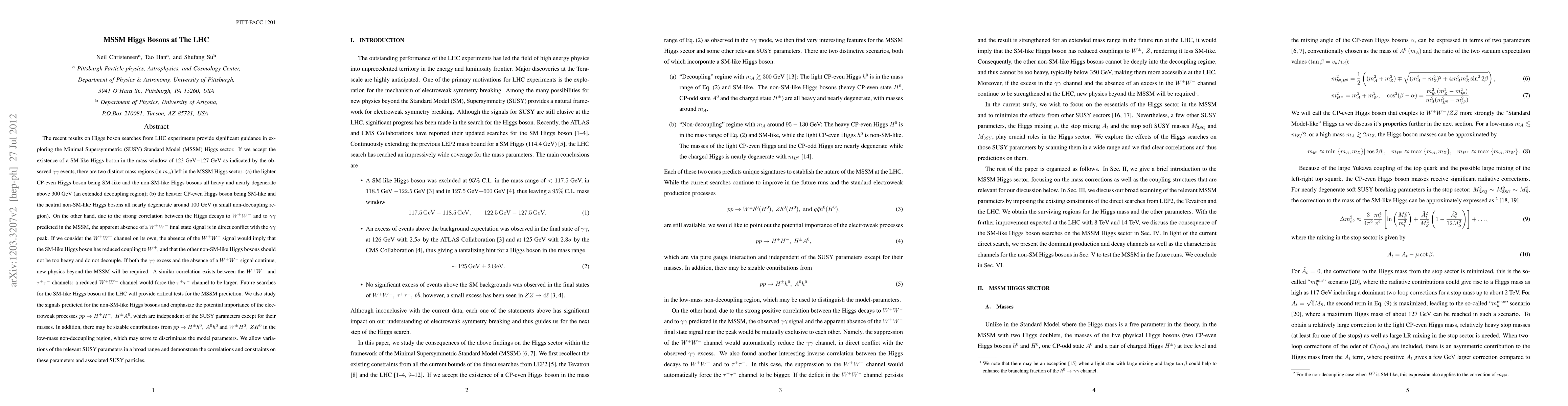 Accepting the existence of a SM-like Higgs boson in the range 123GeV-127GeV as indicated by the observed ga,ga events, there are two distinct regions left in the Minimal Supersymmetric (SUSY) Standard Model (MSSM) Higgs sector: (a) the lighter CP-even Higgs boson SM-like and the non-SM-like Higgs bosons all heavy and nearly degenerate above 300GeV; (b) the heavier CP-even Higgs boson being SM-like and the neutral non-SM-like Higgs bosons all nearly degenerate around 100GeV (a non-decoupling region). Due to the strong correlation between the Higgs decays to W+W- and to ga,ga predicted in the MSSM, the deficit of a W+W- final state signal would be in direct conflict with the ga,ga peak. If we consider W+W- on its own, the absence of the W+W- signal would imply that the SM-like Higgs boson has reduced coupling to W+-, and that the other non-SM-like Higgs bosons should not be too heavy and do not decouple. If both the ga,ga excess and the absence of W+W- continue, new physics beyond the MSSM will be required. A similar correlation exists between the W+W- and tau+tau- channels: a reduced W+W- channel would force the tau+tau- channel to be larger. Future searches for the SM-like Higgs boson at the LHC will provide critical tests for the MSSM prediction. We emphasize the potential importance of the electroweak processes pp->H+H-, H+-A0, which are independent of the SUSY parameters except for their masses. In addition, there may be sizable contributions from pp->H+-h0, A0h0 and W+-H0, ZH0 in the non-decoupling region, which may serve to discriminate the model parameters. We vary the relevant SUSY parameters in a broad range and demonstrate the correlations and constraints on these parameters and associated SUSY particles.