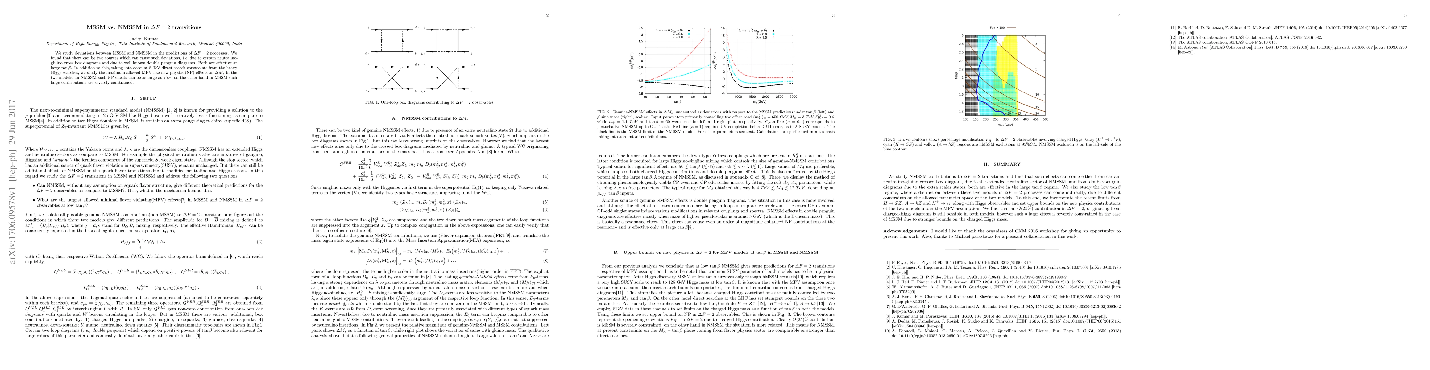 This paper investigates differences in $\Delta F=2$ processes between the Minimal Supersymmetric Standard Model (MSSM) and the Next-to-Minimal Supersymmetric Standard Model (NMSSM), attributing deviations to neutralino-gluino cross box diagrams and double penguin diagrams, both prominent at high $\tan \beta$. It also examines the impact of new physics (NP) effects on $\Delta M_s$, finding that NMSSM can allow up to 25% NP contributions, while MSSM faces stricter constraints.