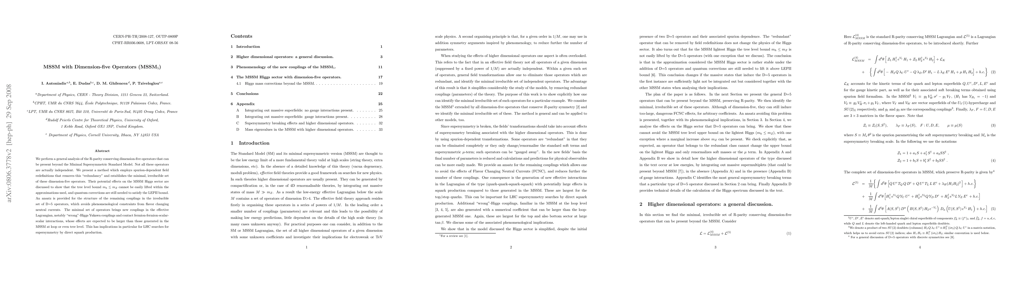We perform a general analysis of the R-parity conserving dimension-five operators that can be present beyond the Minimal Supersymmetric Standard Model. Not all these operators are actually independent. We present a method which employs spurion-dependent field redefinitions that removes this "redundancy" and establishes the minimal, irreducible set of these dimension-five operators. Their potential effects on the MSSM Higgs sector are discussed to show that the tree level bound $m_h\leq m_Z$ cannot be easily lifted within the approximations used, and quantum corrections are still needed to satisfy the LEPII bound. An ansatz is provided for the structure of the remaining couplings in the irreducible set of D=5 operators, which avoids phenomenological constraints from flavor changing neutral currents. The minimal set of operators brings new couplings in the effective Lagrangian, notably "wrong"-Higgs Yukawa couplings and contact fermion-fermion-scalar-scalar interactions, whose effects are expected to be larger than those generated in the MSSM at loop or even tree level. This has implications in particular for LHC searches for supersymmetry by direct squark production.