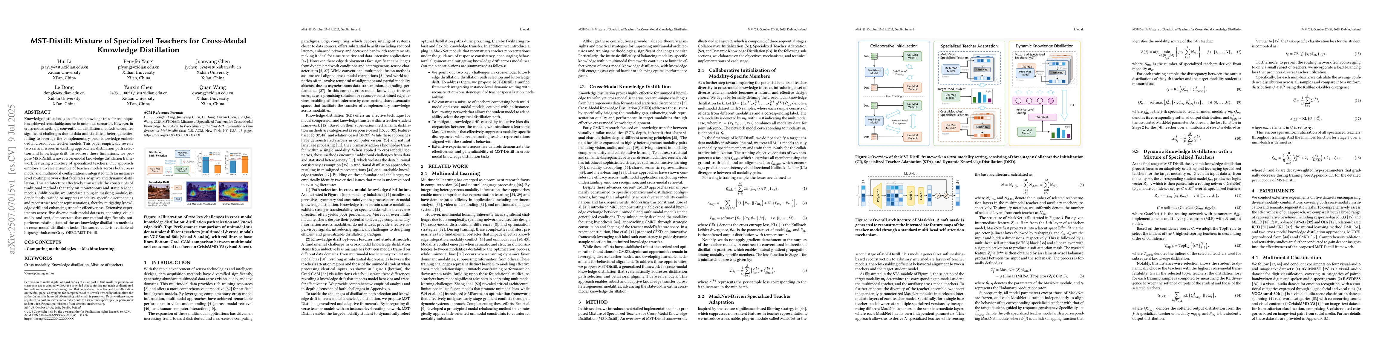 The paper proposes MST-Distill, a novel cross-modal knowledge distillation framework using a mixture of specialized teachers. It addresses distillation path selection and knowledge drift issues through diverse teacher ensembles and an instance-level routing network.