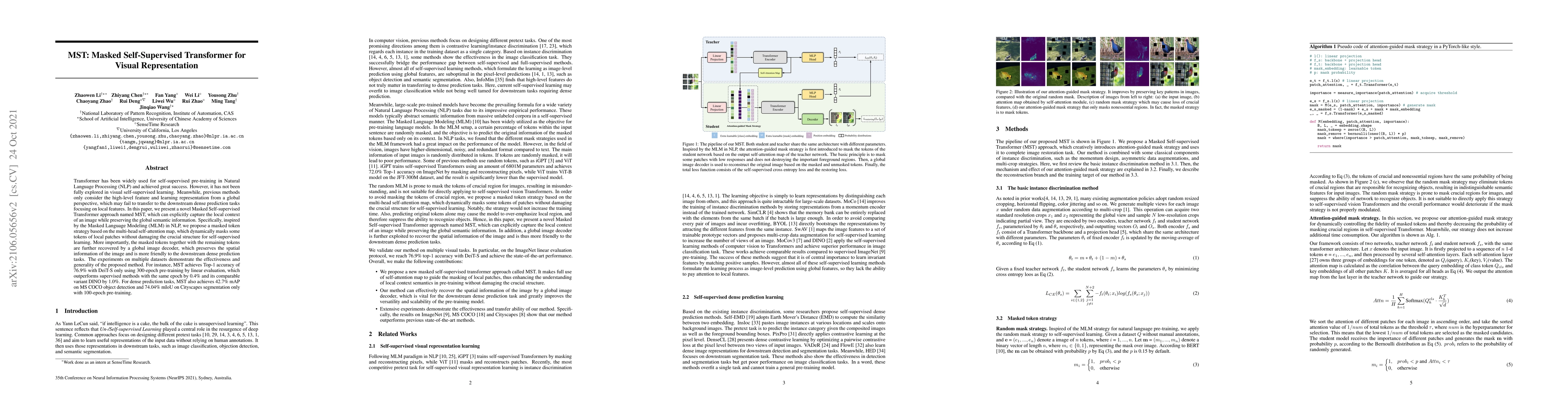The paper introduces MST, a Masked Self-Supervised Transformer for visual representation, which captures local context while preserving global semantics, outperforming supervised methods and achieving high accuracy in dense prediction tasks. MST dynamically masks local patches and recovers them using a global decoder, demonstrating effectiveness across multiple datasets.
