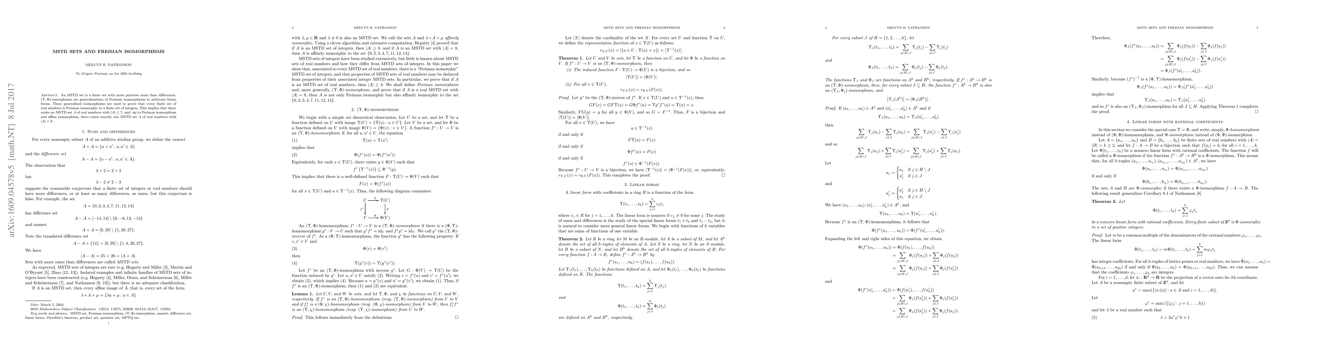 An MSTD set is a finite set with more pairwise sums than differences. $(\Upsilon,\Phi)$-ismorphisms are generalizations of Freiman isomorphisms to arbitrary linear forms. These generalized isomorphisms are used to prove that every finite set of real numbers is Freiman isomorphic to a finite set of integers. This implies that there exists no MSTD set $A$ of real numbers with $|A| \leq 7$, and, up to Freiman isomorphism, there exists exactly one MSTD set $A$ of real numbers with $|A| = 8$.