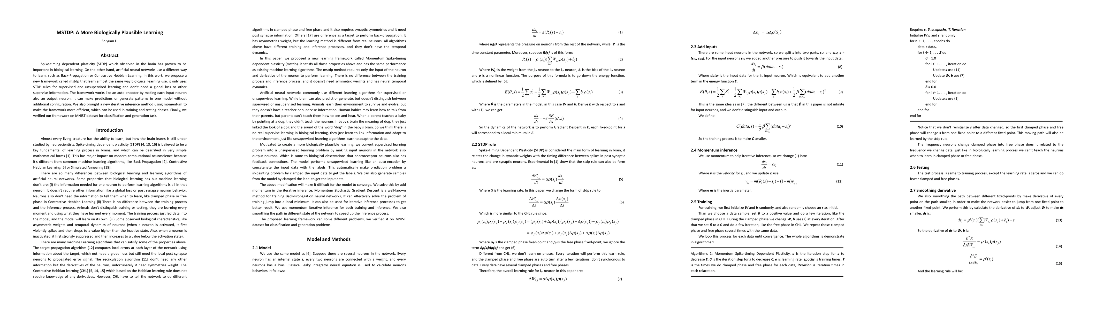 Spike-timing dependent plasticity (STDP) which observed in the brain has proven to be important in biological learning. On the other hand, artificial neural networks use a different way to learn, such as Back-Propagation or Contrastive Hebbian Learning. In this work, we propose a new framework called mstdp that learn almost the same way biological learning use, it only uses STDP rules for supervised and unsupervised learning and don' t need a global loss or other supervise information. The framework works like an auto-encoder by making each input neuron also an output neuron. It can make predictions or generate patterns in one model without additional configuration. We also brought a new iterative inference method using momentum to make the framework more efficient, which can be used in training and testing phases. Finally, we verified our framework on MNIST dataset for classification and generation task.
