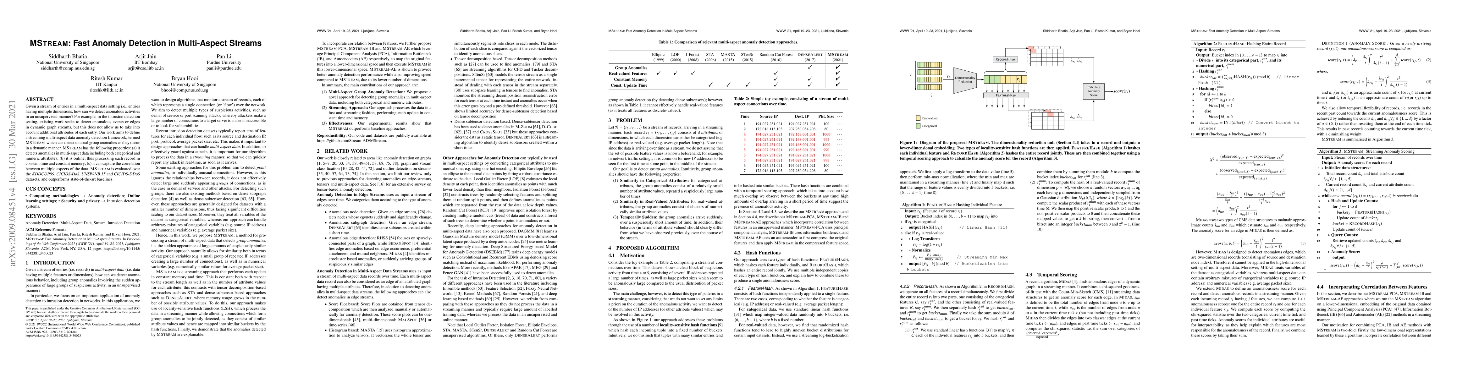 Given a stream of entries in a multi-aspect data setting i.e., entries having multiple dimensions, how can we detect anomalous activities in an unsupervised manner? For example, in the intrusion detection setting, existing work seeks to detect anomalous events or edges in dynamic graph streams, but this does not allow us to take into account additional attributes of each entry. Our work aims to define a streaming multi-aspect data anomaly detection framework, termed MSTREAM which can detect unusual group anomalies as they occur, in a dynamic manner. MSTREAM has the following properties: (a) it detects anomalies in multi-aspect data including both categorical and numeric attributes; (b) it is online, thus processing each record in constant time and constant memory; (c) it can capture the correlation between multiple aspects of the data. MSTREAM is evaluated over the KDDCUP99, CICIDS-DoS, UNSW-NB 15 and CICIDS-DDoS datasets, and outperforms state-of-the-art baselines.