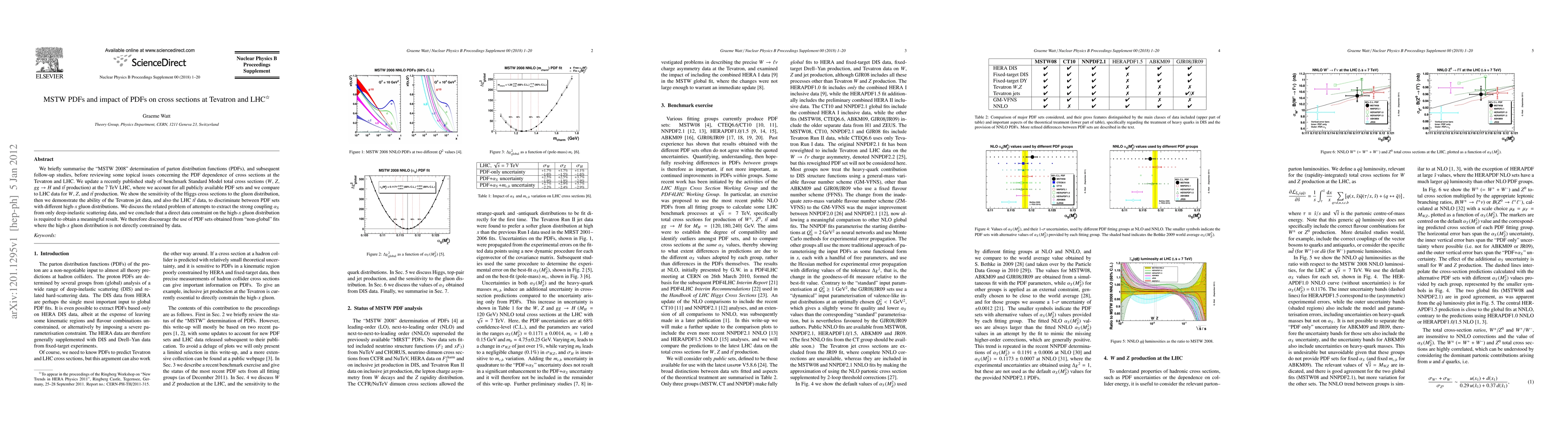 This paper reviews the MSTW 2008 parton distribution functions (PDFs) and their impact on cross sections at the Tevatron and LHC, updating benchmark Standard Model total cross sections at the 7 TeV LHC. It emphasizes the sensitivity of Higgs cross sections to the gluon distribution and the importance of direct data constraints on high-x gluon distributions for meaningful results.