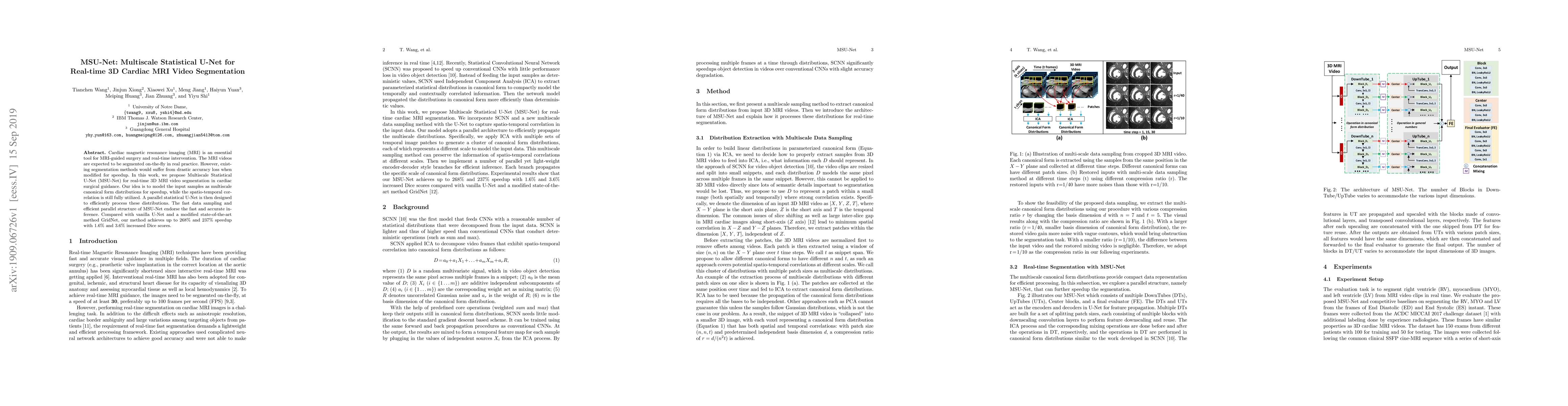 MSU-Net is a novel Multiscale Statistical U-Net designed for real-time 3D cardiac MRI video segmentation, achieving significant speedups while maintaining high accuracy compared to traditional U-Net and GridNet methods. The method models input data as multiscale distributions and employs a parallel statistical U-Net to efficiently process them, resulting in substantial performance gains.