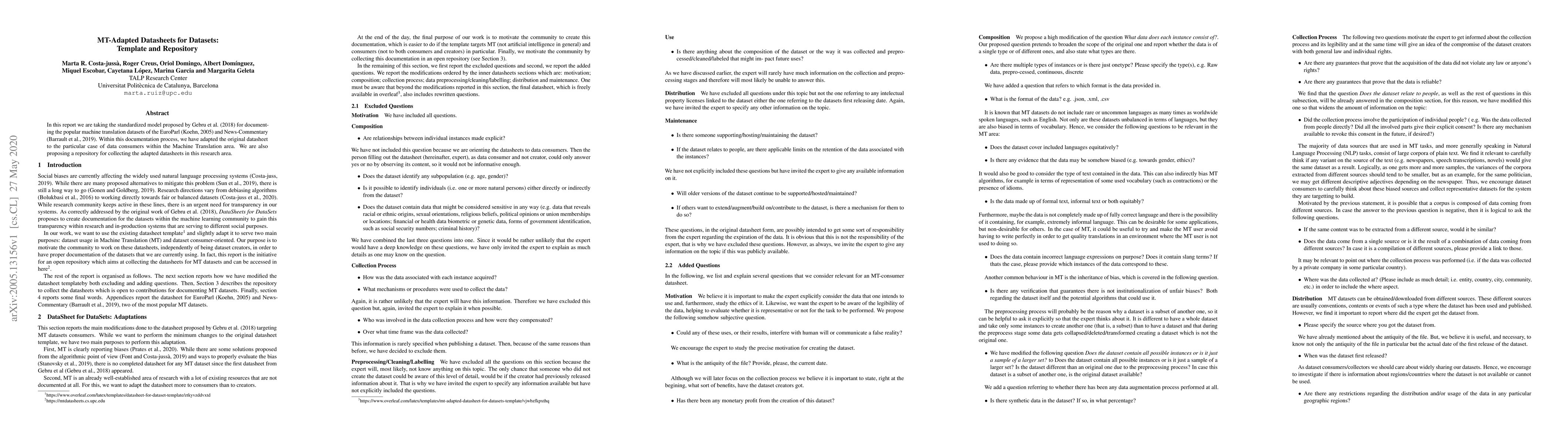 In this report we are taking the standardized model proposed by Gebru et al. (2018) for documenting the popular machine translation datasets of the EuroParl (Koehn, 2005) and News-Commentary (Barrault et al., 2019). Within this documentation process, we have adapted the original datasheet to the particular case of data consumers within the Machine Translation area. We are also proposing a repository for collecting the adapted datasheets in this research area