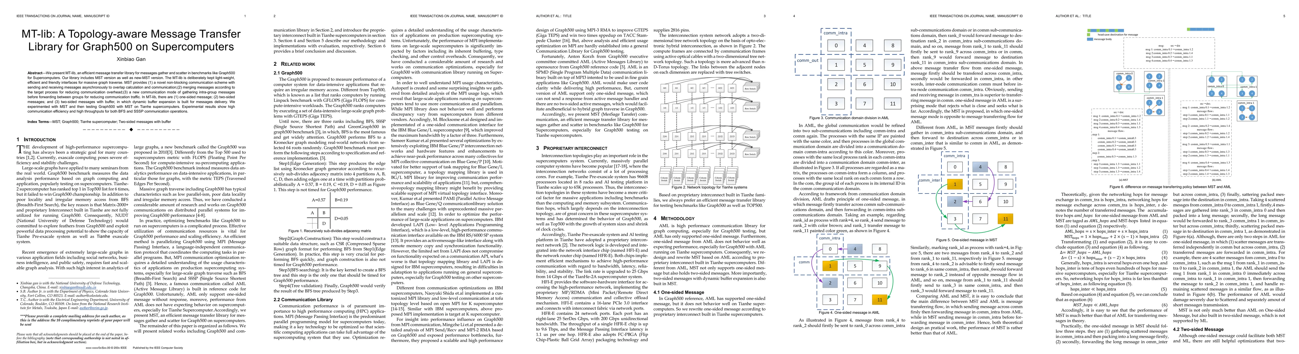 MT-lib is a lightweight, topology-aware message transfer library designed for efficient message gather and scatter operations in Graph500 benchmarks on supercomputers. It features a novel non-blocking communication scheme and dynamic buffer expansion, achieving high communication efficiency and throughputs for BFS and SSSP operations.