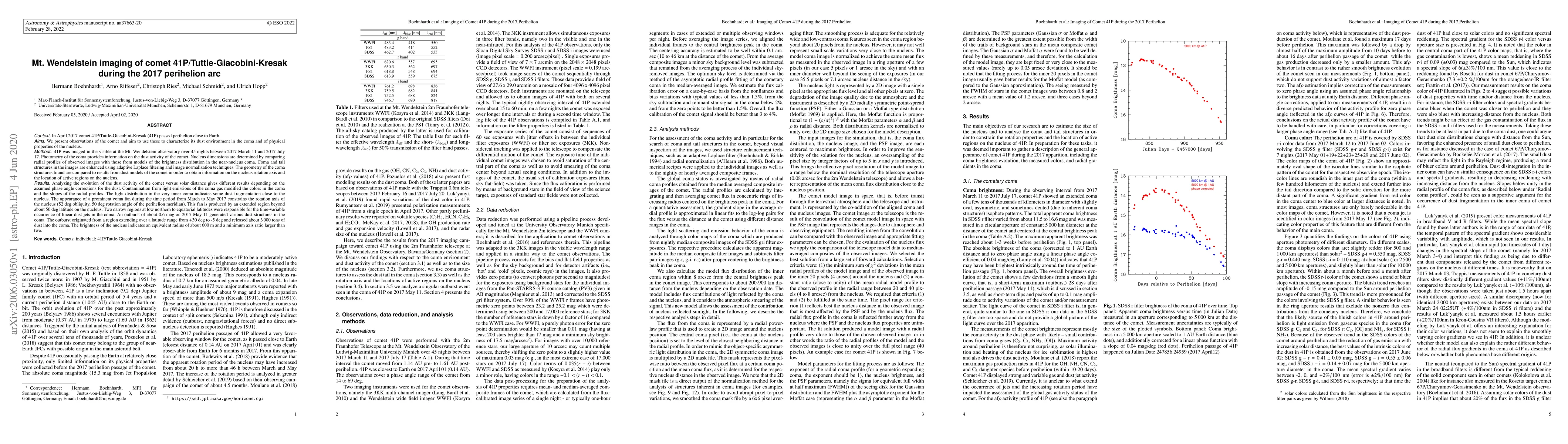 This study used the Mount Wendelstein Observatory's 2 m telescope to image comet 41P during its 2017 perihelion, revealing a small nucleus with an unusual high body axis ratio and a long-lasting coma fan from a high-latitude region. Dust activity showed a steep radial decline, suggesting fragmentation and a singular outburst.