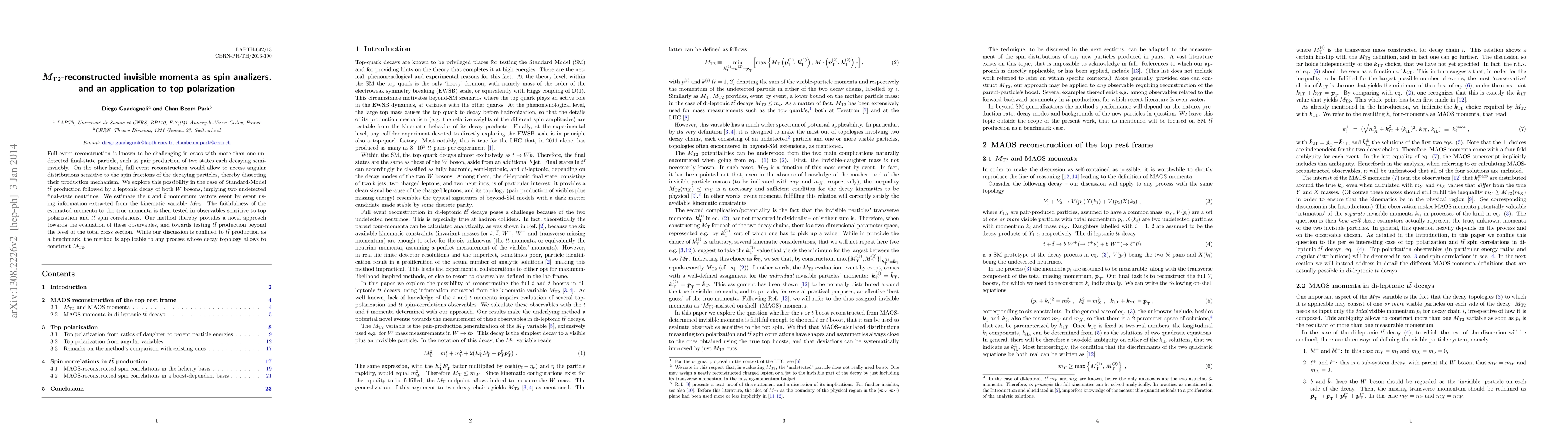 Full event reconstruction is known to be challenging in cases with more than one undetected final-state particle, such as pair production of two states each decaying semi-invisibly. On the other hand, full event reconstruction would allow to access angular distributions sensitive to the spin fractions of the decaying particles, thereby dissecting their production mechanism. We explore this possibility in the case of Standard-Model t-tbar production followed by a leptonic decay of both W bosons, implying two undetected final-state neutrinos. We estimate the t and tbar momentum vectors event by event using information extracted from the kinematic variable MT2. The faithfulness of the estimated momenta to the true momenta is then tested in observables sensitive to top polarization and t-tbar spin correlations. Our method thereby provides a novel approach towards the evaluation of these observables, and towards testing t-tbar production beyond the level of the total cross section. While our discussion is confined to t-tbar production as a benchmark, the method is applicable to any process whose decay topology allows to construct MT2.