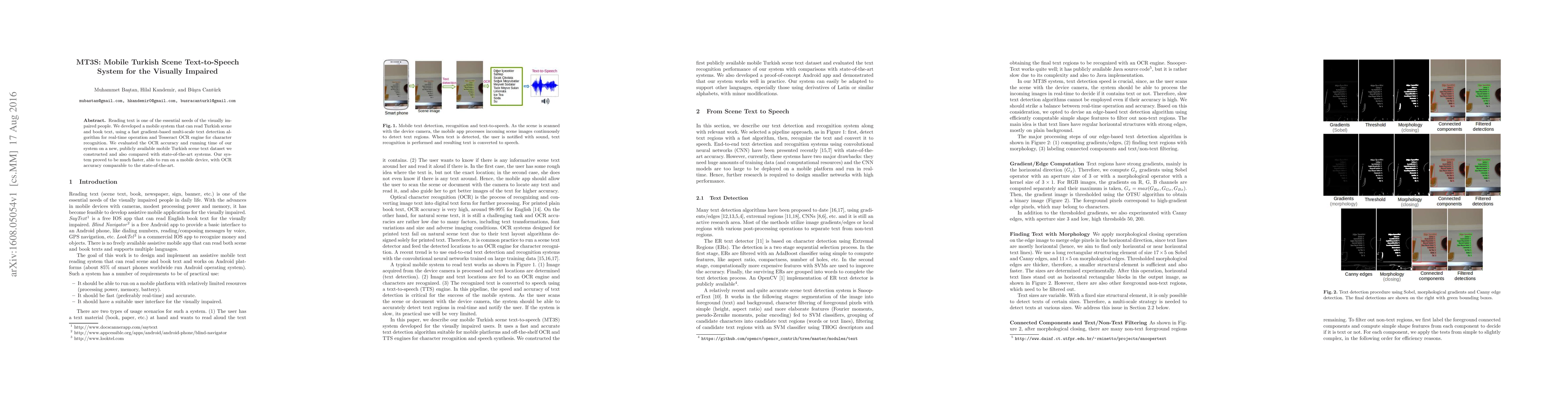 The MT3S system provides a mobile solution for reading Turkish scene and book text for the visually impaired, utilizing a fast multi-scale text detection algorithm and Tesseract OCR. Evaluations show it is faster than other systems and maintains comparable OCR accuracy.