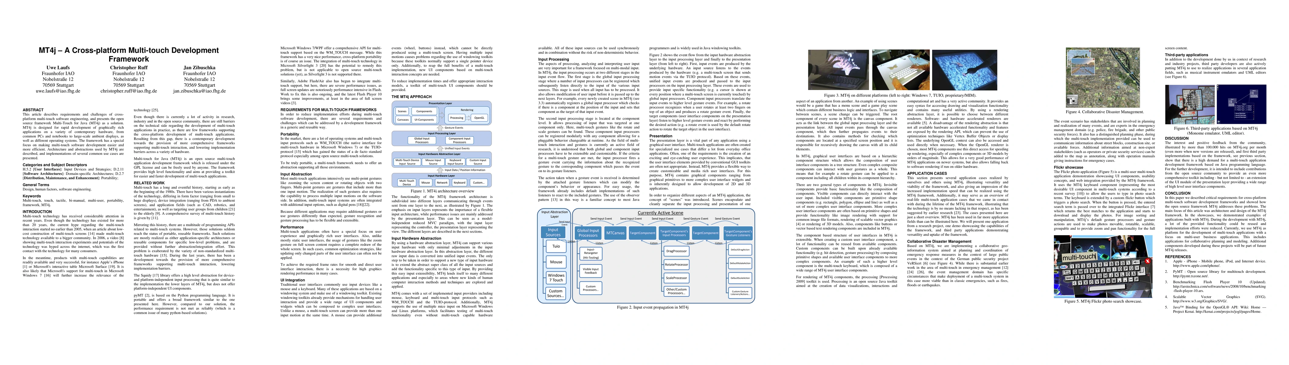 This article describes requirements and challenges of crossplatform multi-touch software engineering, and presents the open source framework Multi-Touch for Java (MT4j) as a solution. MT4j is designed for rapid development of graphically rich applications on a variety of contemporary hardware, from common PCs and notebooks to large-scale ambient displays, as well as different operating systems. The framework has a special focus on making multi-touch software development easier and more efficient. Architecture and abstractions used by MT4j are described, and implementations of several common use cases are presented.