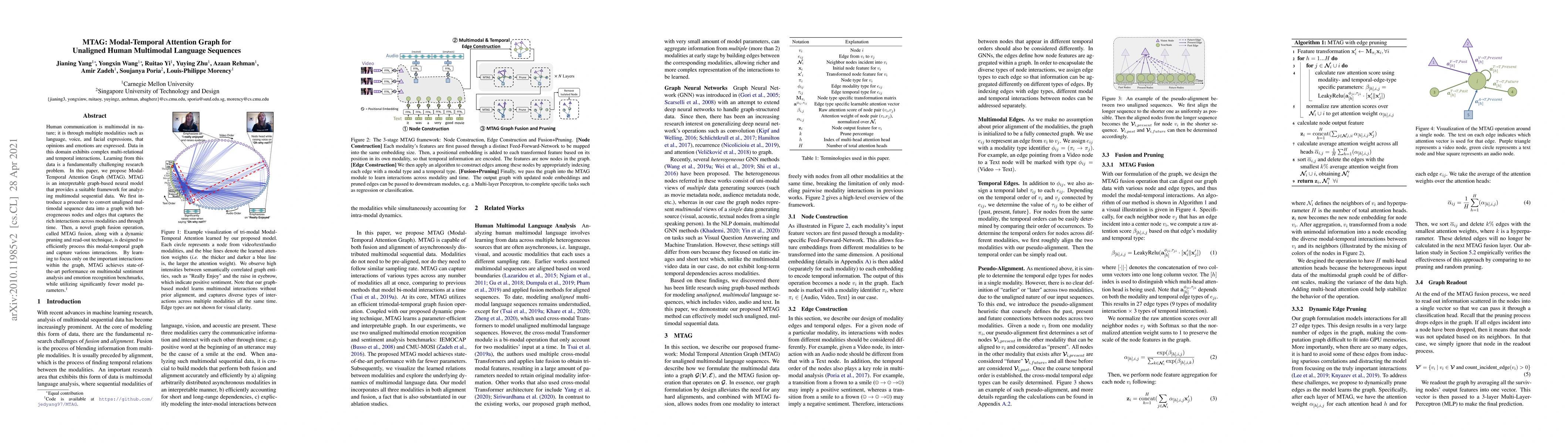 The paper proposes MTAG, a graph-based neural model for analyzing unaligned multimodal language sequences by converting them into a heterogeneous graph that captures interactions across modalities and over time. MTAG achieves state-of-the-art results in multimodal sentiment analysis and emotion recognition while using fewer parameters.