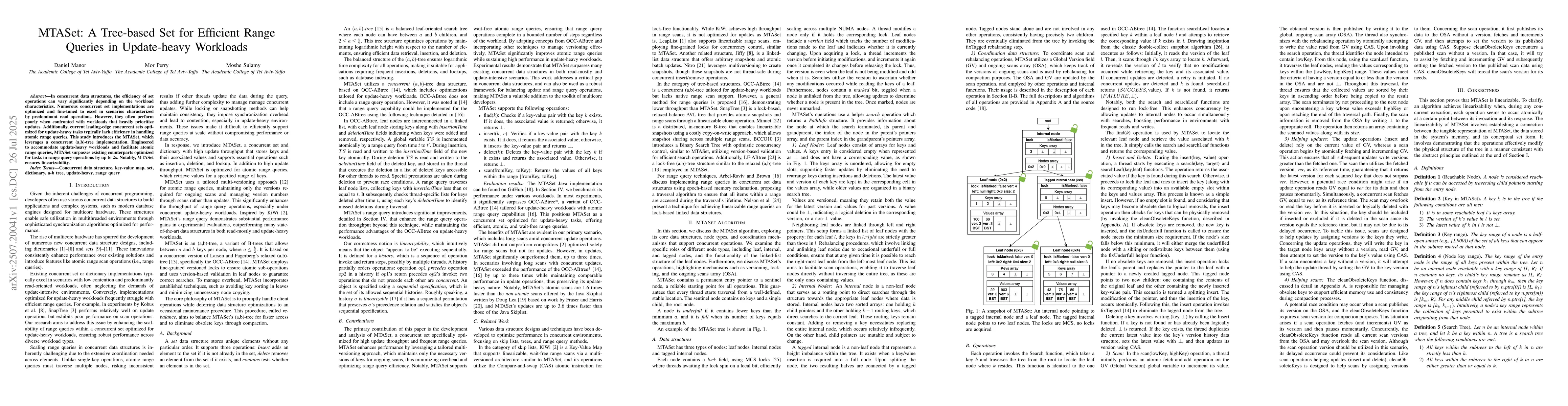 In concurrent data structures, the efficiency of set operations can vary significantly depending on the workload characteristics. Numerous concurrent set implementations are optimized and fine-tuned to excel in scenarios characterized by predominant read operations. However, they often perform poorly when confronted with workloads that heavily prioritize updates. Additionally, current leading-edge concurrent sets optimized for update-heavy tasks typically lack efficiency in handling atomic range queries. This study introduces the MTASet, which leverages a concurrent (a,b)-tree implementation. Engineered to accommodate update-heavy workloads and facilitate atomic range queries, MTASet surpasses existing counterparts optimized for tasks in range query operations by up to 2x. Notably, MTASet ensures linearizability.