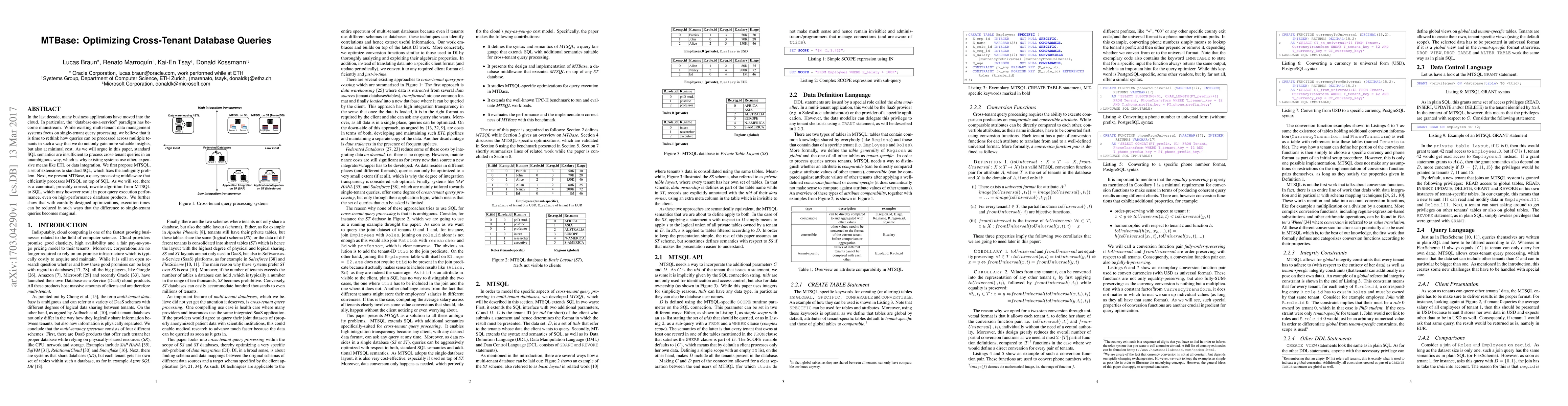 This paper proposes MTSQL, an extension to standard SQL for processing cross-tenant queries, and MTBase, a middleware optimizing these queries. It addresses the inefficiencies of existing systems and demonstrates significant performance improvements through carefully designed optimizations.