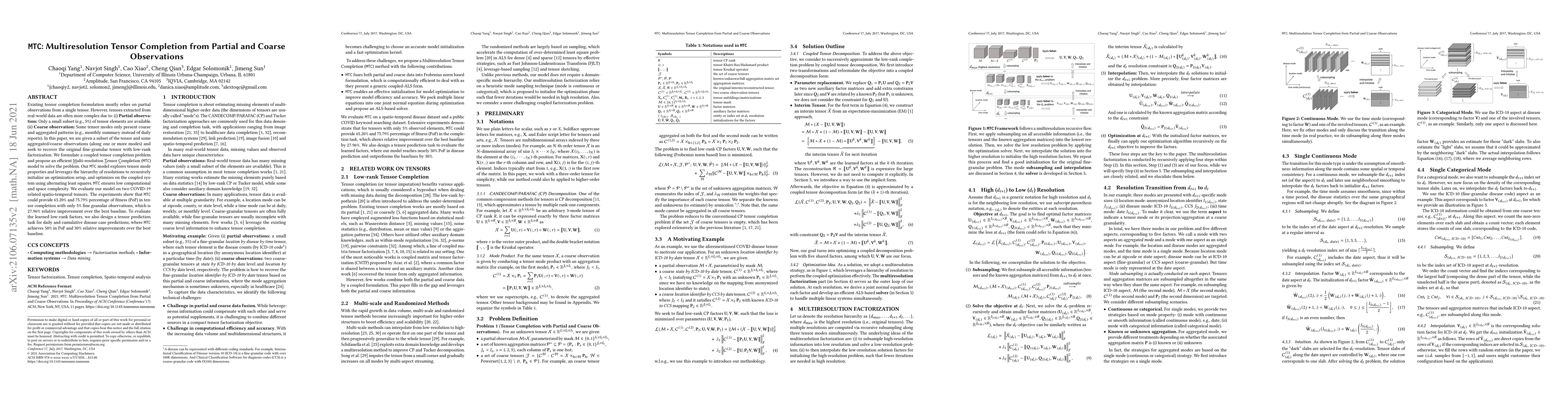 Existing tensor completion formulation mostly relies on partial observations from a single tensor. However, tensors extracted from real-world data are often more complex due to: (i) Partial observation: Only a small subset (e.g., 5%) of tensor elements are available. (ii) Coarse observation: Some tensor modes only present coarse and aggregated patterns (e.g., monthly summary instead of daily reports). In this paper, we are given a subset of the tensor and some aggregated/coarse observations (along one or more modes) and seek to recover the original fine-granular tensor with low-rank factorization. We formulate a coupled tensor completion problem and propose an efficient Multi-resolution Tensor Completion model (MTC) to solve the problem. Our MTC model explores tensor mode properties and leverages the hierarchy of resolutions to recursively initialize an optimization setup, and optimizes on the coupled system using alternating least squares. MTC ensures low computational and space complexity. We evaluate our model on two COVID-19 related spatio-temporal tensors. The experiments show that MTC could provide 65.20% and 75.79% percentage of fitness (PoF) in tensor completion with only 5% fine granular observations, which is 27.96% relative improvement over the best baseline. To evaluate the learned low-rank factors, we also design a tensor prediction task for daily and cumulative disease case predictions, where MTC achieves 50% in PoF and 30% relative improvements over the best baseline.