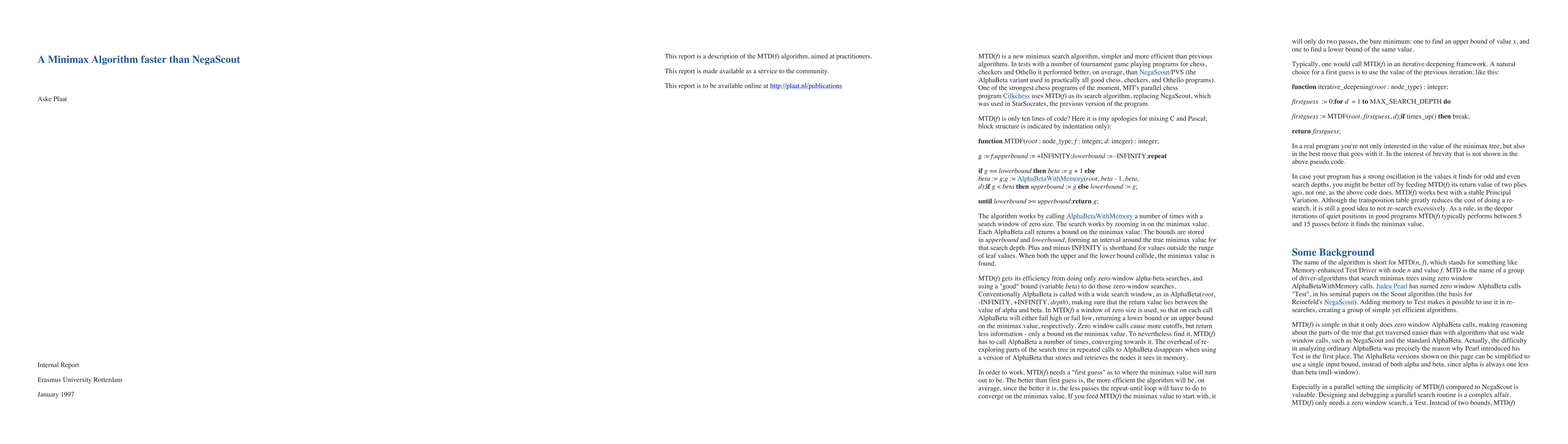 MTD(f) is a new minimax search algorithm, simpler and more efficient than previous algorithms. In tests with a number of tournament game playing programs for chess, checkers and Othello it performed better, on average, than NegaScout/PVS (the AlphaBeta variant used in practically all good chess, checkers, and Othello programs). One of the strongest chess programs of the moment, MIT's parallel chess program Cilkchess uses MTD(f) as its search algorithm, replacing NegaScout, which was used in StarSocrates, the previous version of the program.