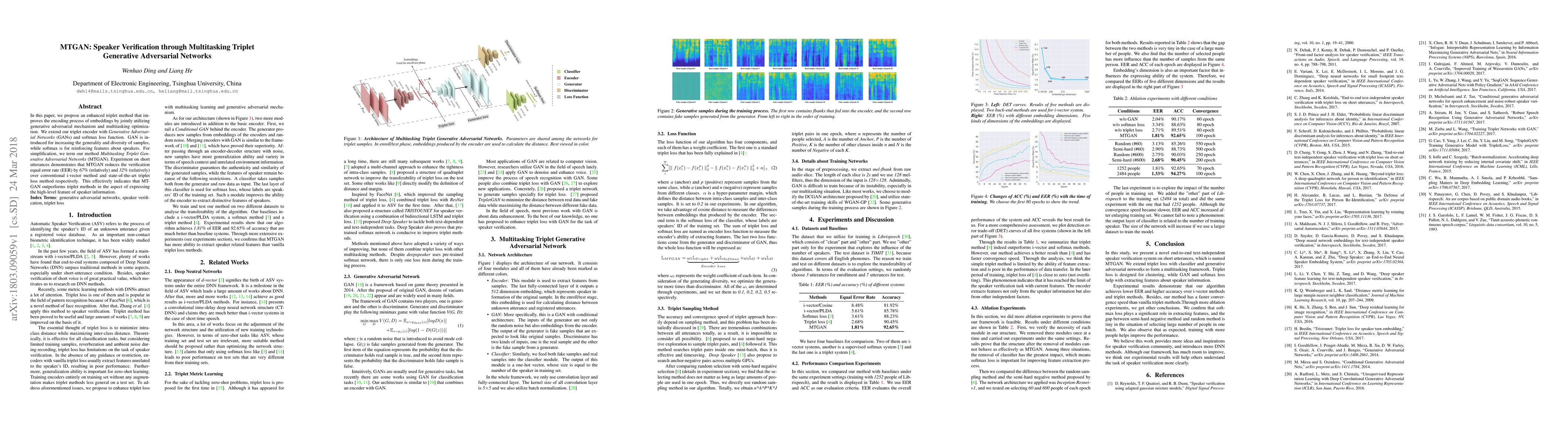 The paper proposes MTGAN, a multitasking triplet Generative Adversarial Network for speaker verification, which combines GANs and softmax loss to enhance embedding encoding. Experiments show MTGAN reduces the verification equal error rate by 67% and 32% compared to conventional and state-of-the-art methods, respectively.