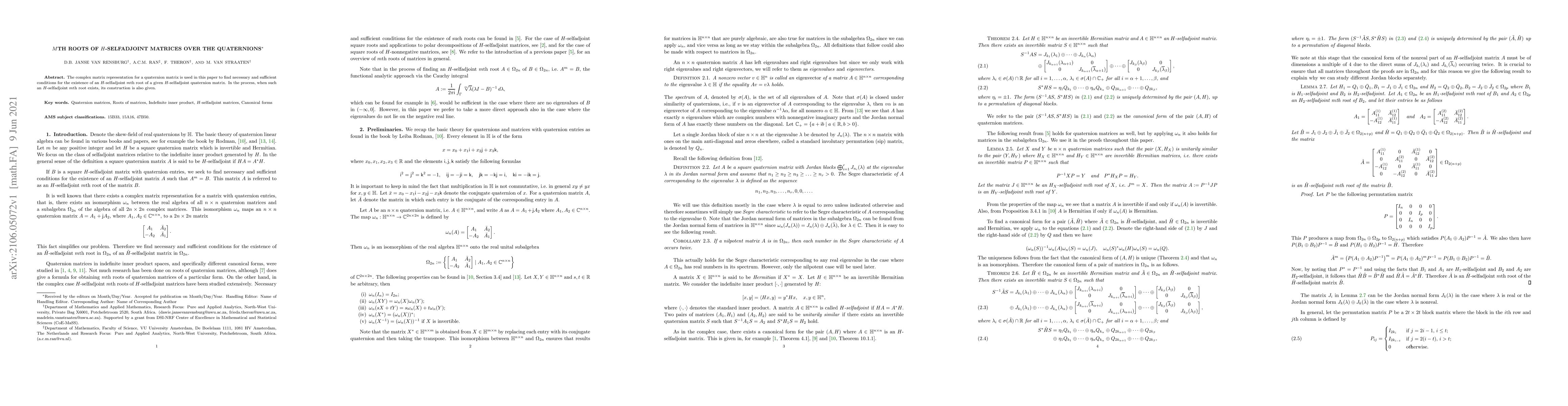 The complex matrix representation for a quaternion matrix is used in this paper to find necessary and sufficient conditions for the existence of an $H$-selfadjoint $m$th root of a given $H$-selfadjoint quaternion matrix. In the process, when such an $H$-selfadjoint $m$th root exists, its construction is also given.
