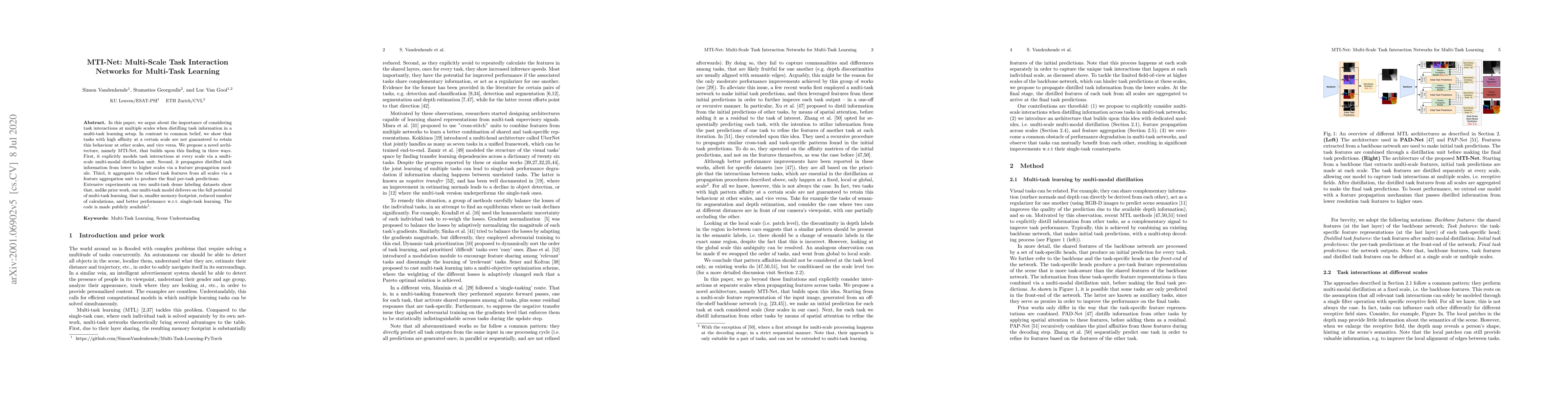 MTI-Net proposes a novel multi-scale task interaction network that models task relationships at different scales to enhance multi-task learning efficiency and performance. Extensive experiments demonstrate its advantages over single-task learning in terms of memory usage, computational efficiency, and overall performance.