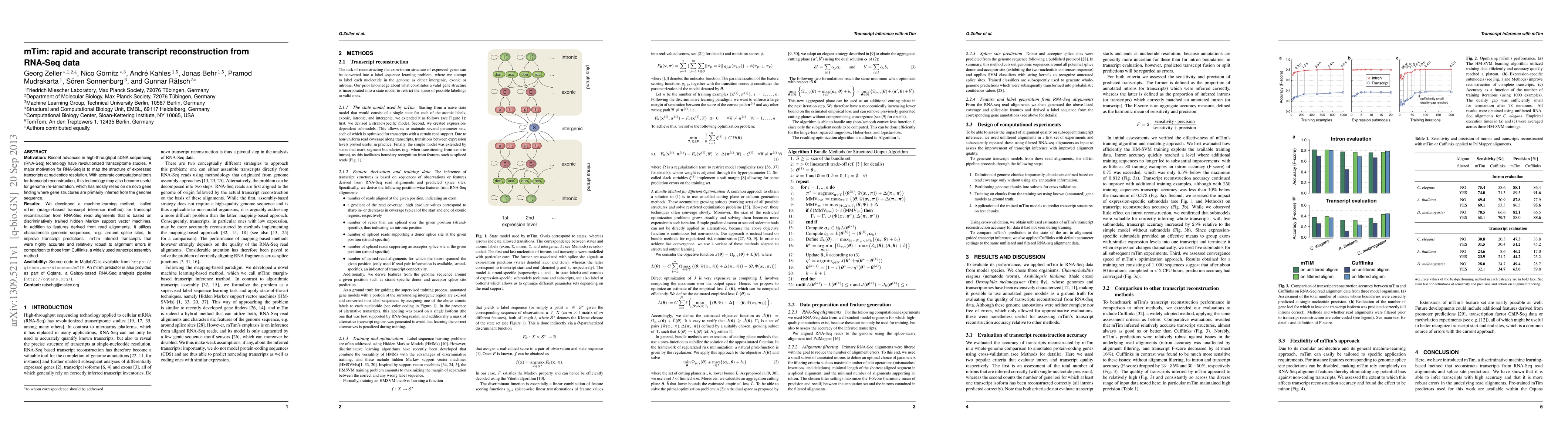 The paper introduces mTim, a machine-learning method for transcript reconstruction from RNA-Seq data, which uses discriminatively trained hidden Markov support vector machines and improves accuracy by incorporating genomic sequence features. mTim demonstrates higher accuracy and robustness compared to Cufflinks, a commonly used transcript assembly method.