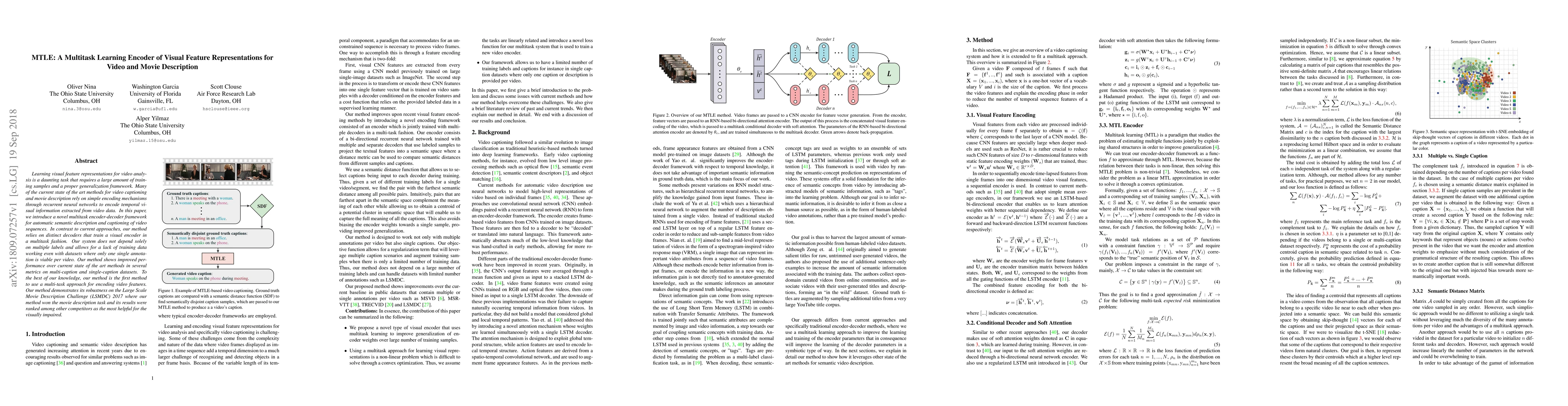 Learning visual feature representations for video analysis is a daunting task that requires a large amount of training samples and a proper generalization framework. Many of the current state of the art methods for video captioning and movie description rely on simple encoding mechanisms through recurrent neural networks to encode temporal visual information extracted from video data. In this paper, we introduce a novel multitask encoder-decoder framework for automatic semantic description and captioning of video sequences. In contrast to current approaches, our method relies on distinct decoders that train a visual encoder in a multitask fashion. Our system does not depend solely on multiple labels and allows for a lack of training data working even with datasets where only one single annotation is viable per video. Our method shows improved performance over current state of the art methods in several metrics on multi-caption and single-caption datasets. To the best of our knowledge, our method is the first method to use a multitask approach for encoding video features. Our method demonstrates its robustness on the Large Scale Movie Description Challenge (LSMDC) 2017 where our method won the movie description task and its results were ranked among other competitors as the most helpful for the visually impaired.