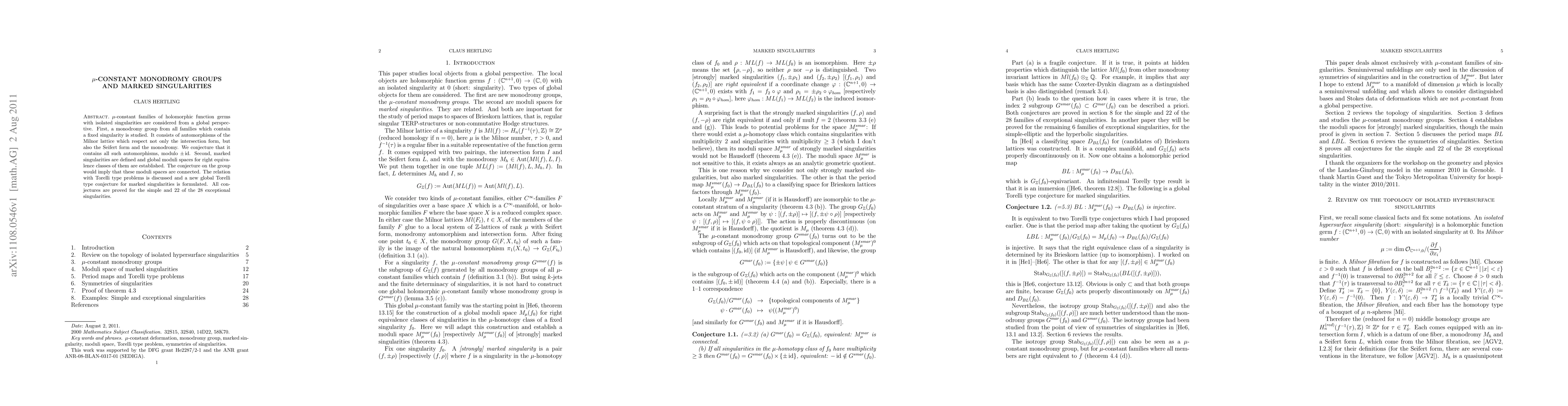 This paper explores mu-constant families of holomorphic function germs, focusing on their monodromy groups and marked singularities. It conjectures that the monodromy group contains all relevant automorphisms, modulo identity and negative identity, and suggests this implies connected global moduli spaces for marked singularities. The conjectures are proven for 23 specific exceptional singularities.