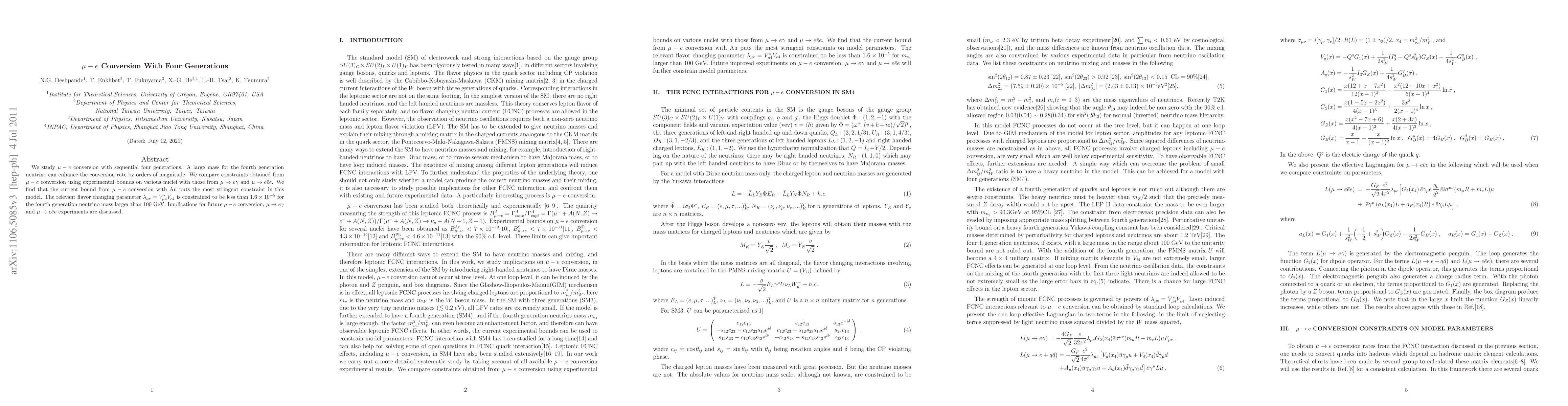 We study $\mu - e$ conversion with sequential four generations. A large mass for the fourth generation neutrino can enhance the conversion rate by orders of magnitude. We compare constraints obtained from $\mu - e$ conversion using experimental bounds on various nuclei with those from $\mu \to e \gamma$ and $\mu \to e\bar e e$. We find that the current bound from $\mu - e$ conversion with Au puts the most stringent constraint in this model. The relevant flavor changing parameter $\lambda_{\mu e} = V^*_{\mu 4}V_{e4}^{}$ is constrained to be less than $1.6\times 10^{-5}$ for the fourth generation neutrino mass larger than 100 GeV. Implications for future $\mu -e$ conversion, $\mu \to e\gamma$ and $\mu \to e\bar e e$ experiments are discussed.